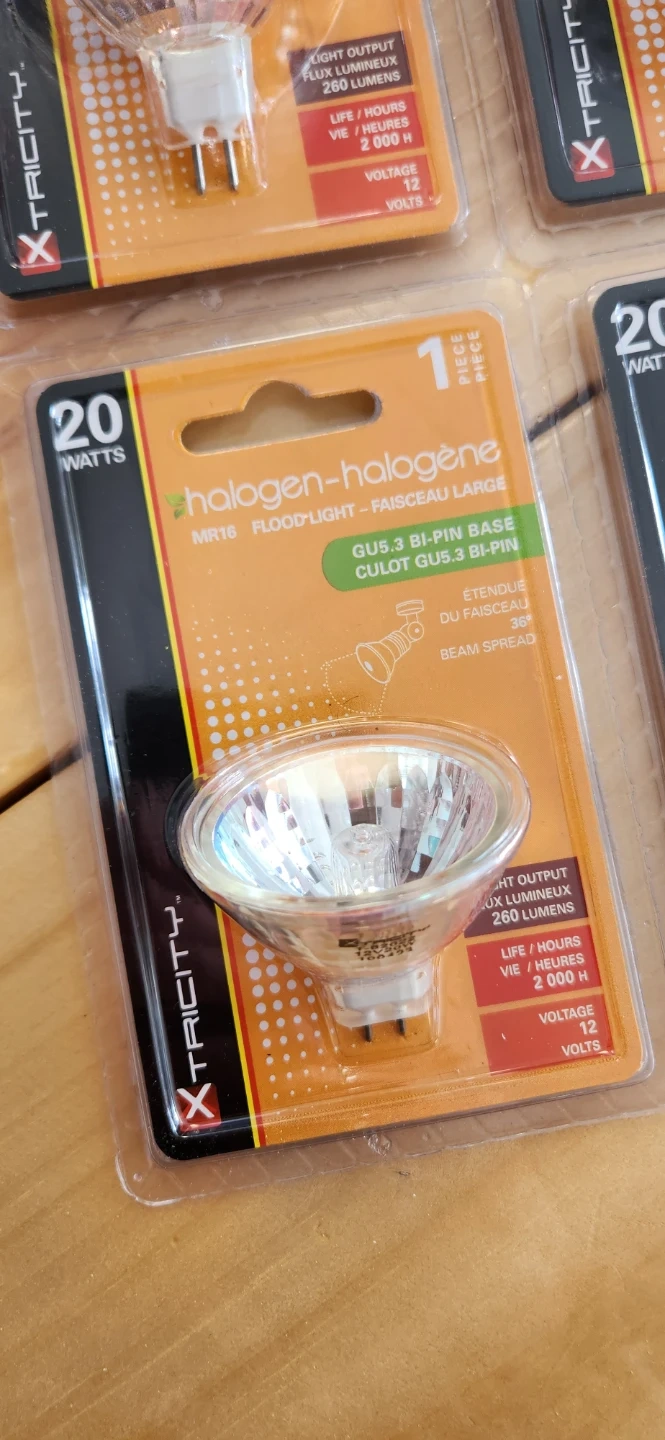 Xtricity halogen floodlight bulbs. MR16 GU5.3 bi-pin base. 20 watts, 12 volts. 2000 hours of life. 260 lumens light output. Beam spread is 36 degrees.