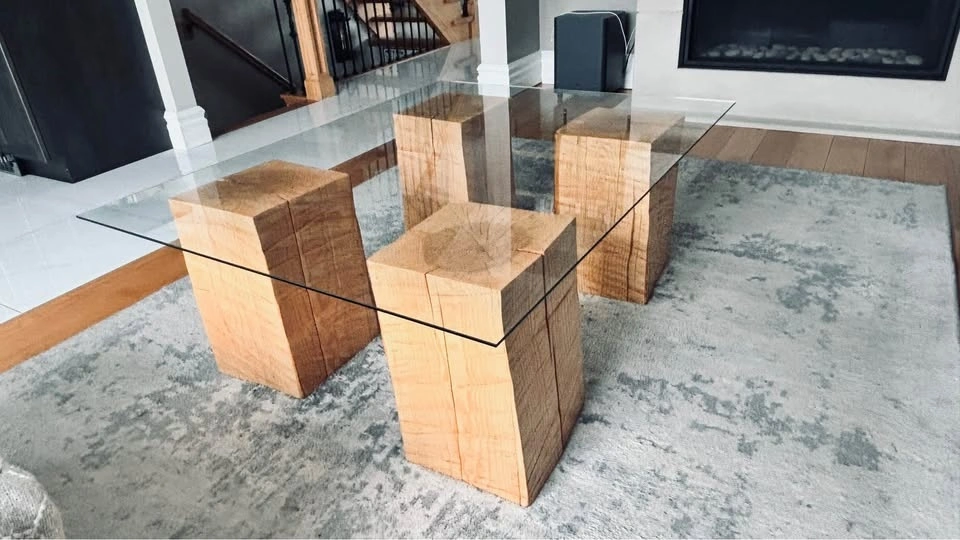 Unique solid ash block coffee table with tempered glass top. Super sturdy and has a natural wood look. Glass is clear. Great for modern or rustic vibes. Glass top 50” x 38”. Solid Ash block legs 10” x 11” x 17” high.
