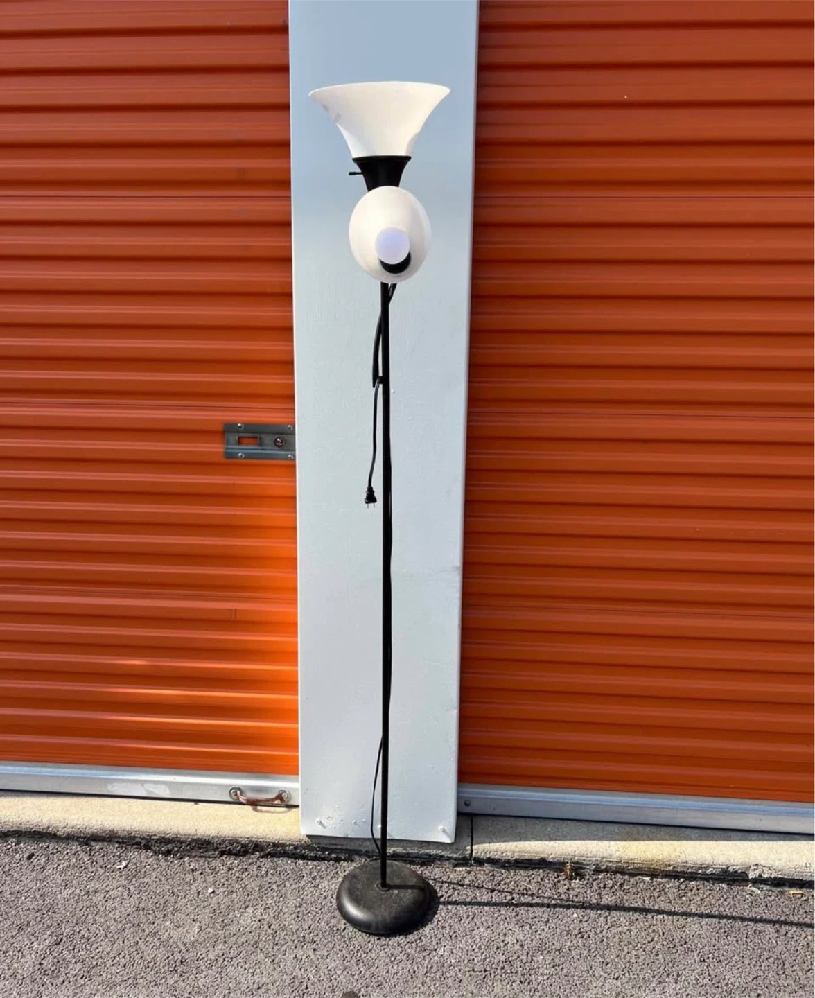 This black floor lamp features a main light with a white cone shade and an adjustable reading light. It has a sturdy round base and a flexible gooseneck for the reading light. It's in good working condition!