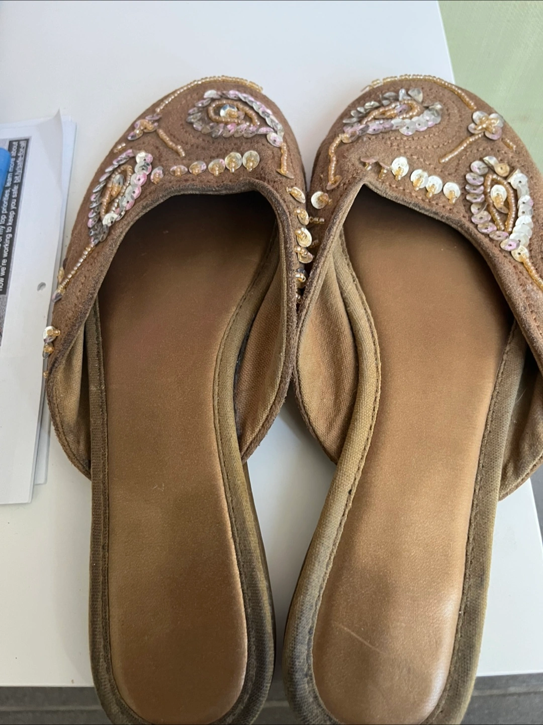 Cute pair of brown mules with sequin and bead embellishments! They're in good condition and ready for a new home. Perfect for adding a touch of sparkle to your outfit