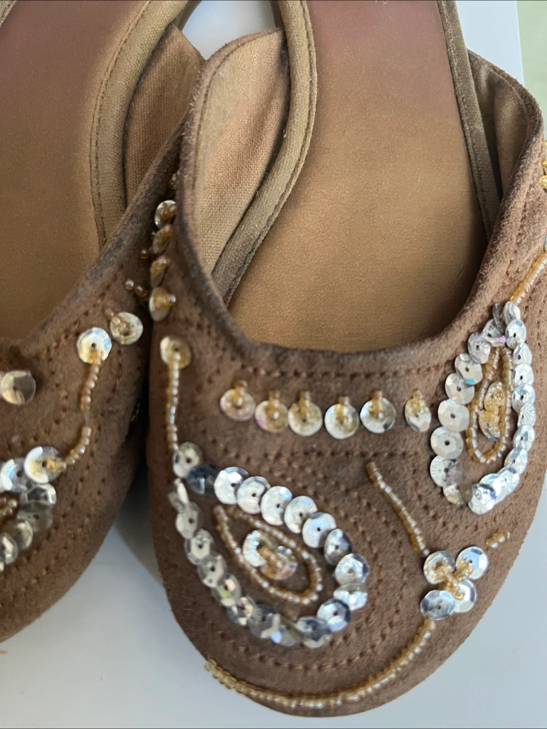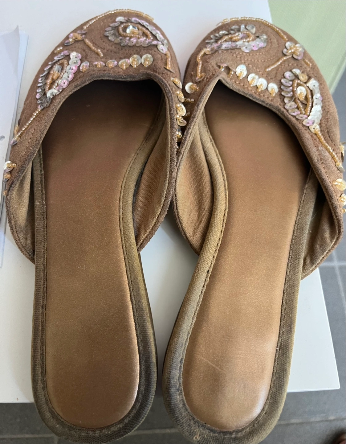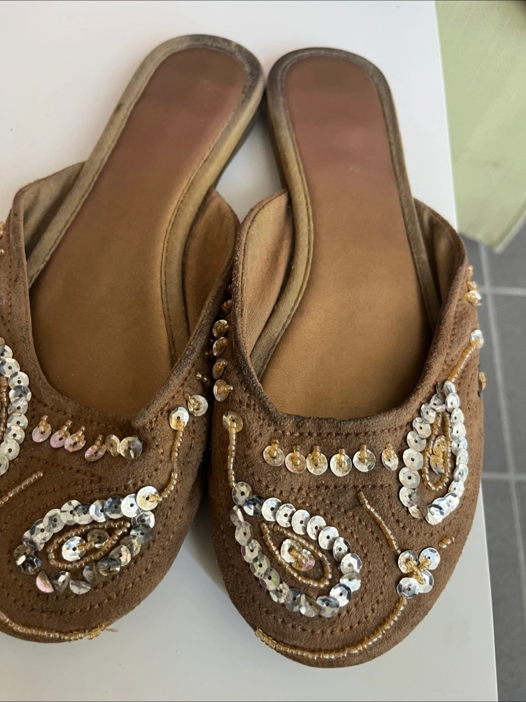 Cute pair of brown mules with sequin and bead embellishments! They're in good condition and ready for a new home. Perfect for adding a touch of sparkle to your outfit