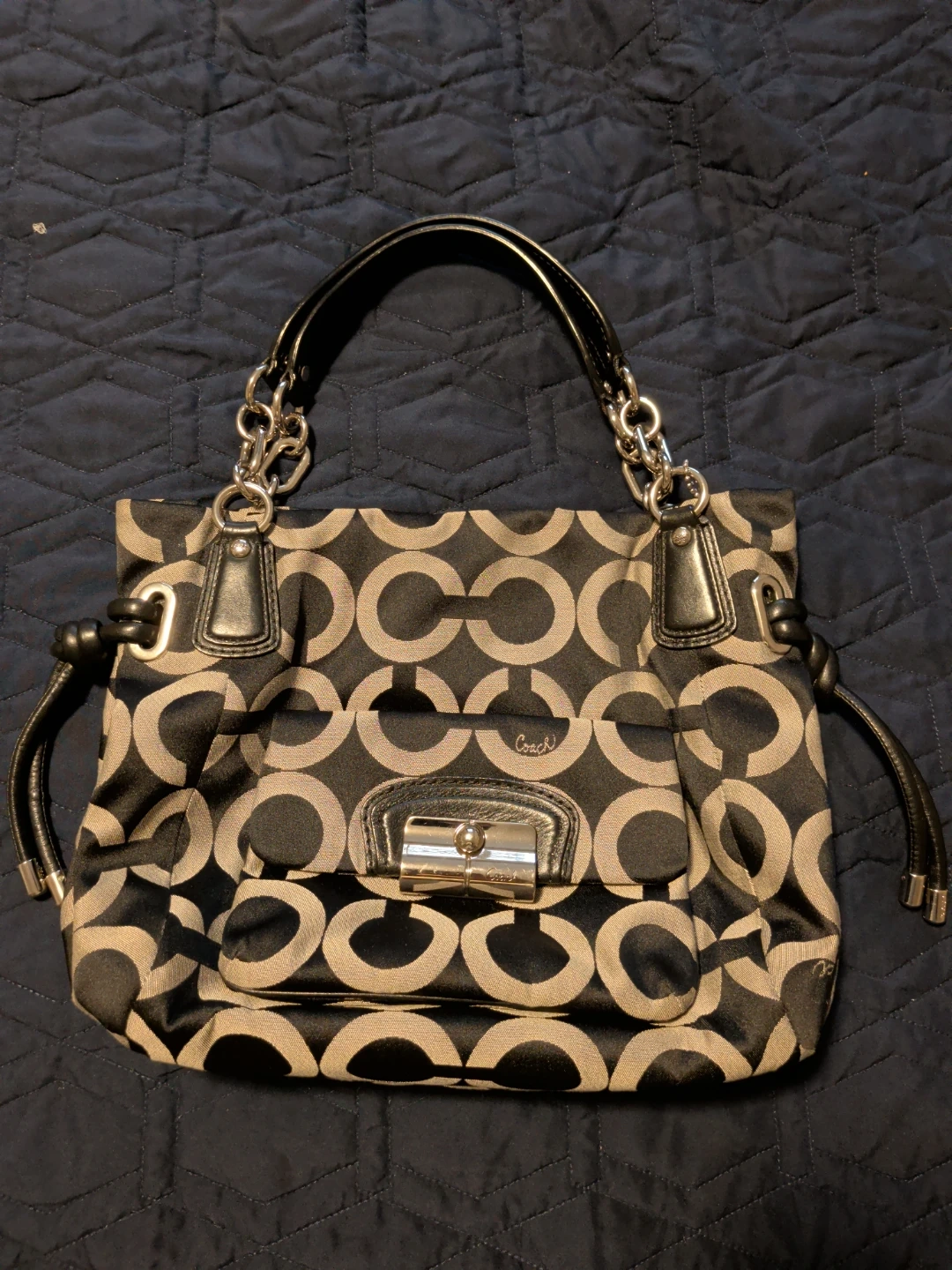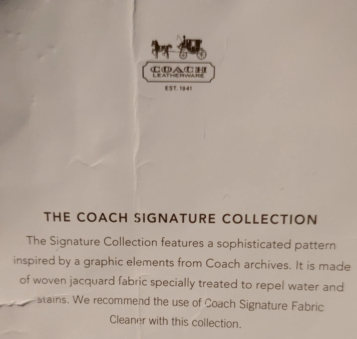 This is an original Coach Signature Collection shoulder bag. It's made of woven jacquard fabric treated to repel water and stains. The pattern is inspired by graphic elements from Coach archives. It's a stylish accessory for everyday use!