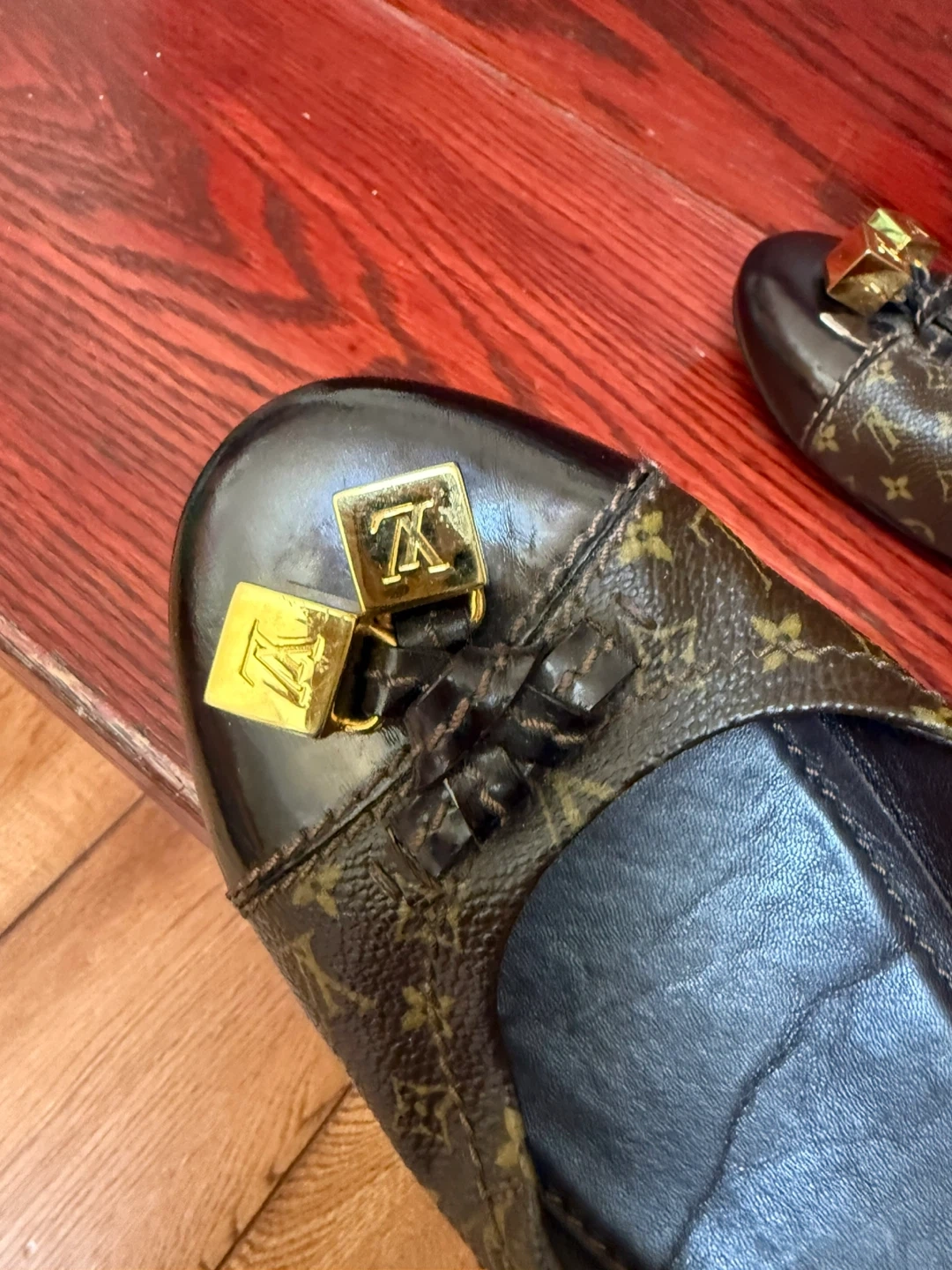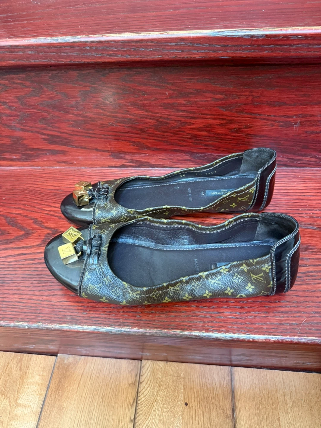Selling a pair of Louis Vuitton ballet flats in size 38. They are brown leather with the classic LV monogram pattern. These flats are in good condition and ready for a new home!