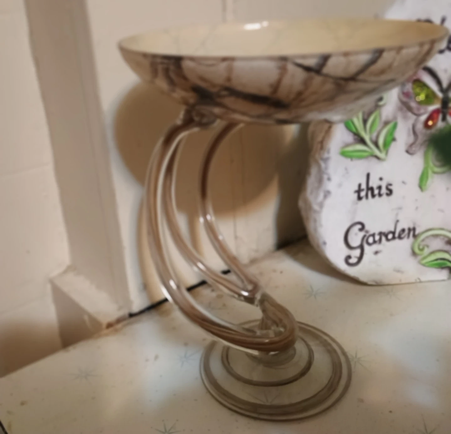 A unique decorative candy dish featuring a swirled glass stand and a marbled bowl. It's suitable for holding candies, trinkets, or as a statement piece. The stand is made of clear, twisted glass.