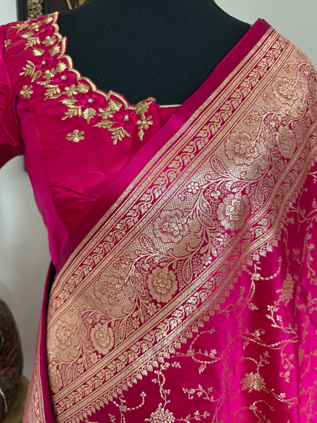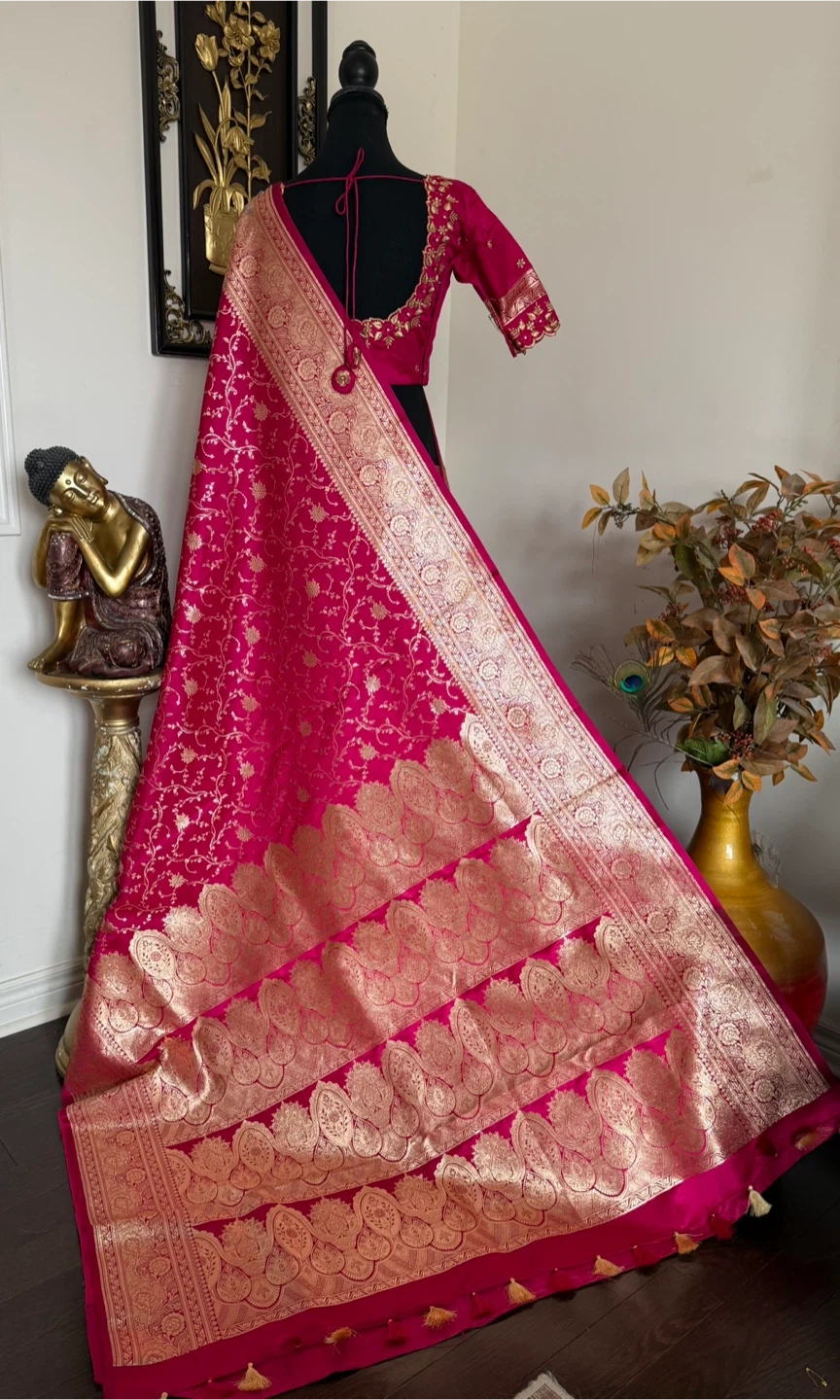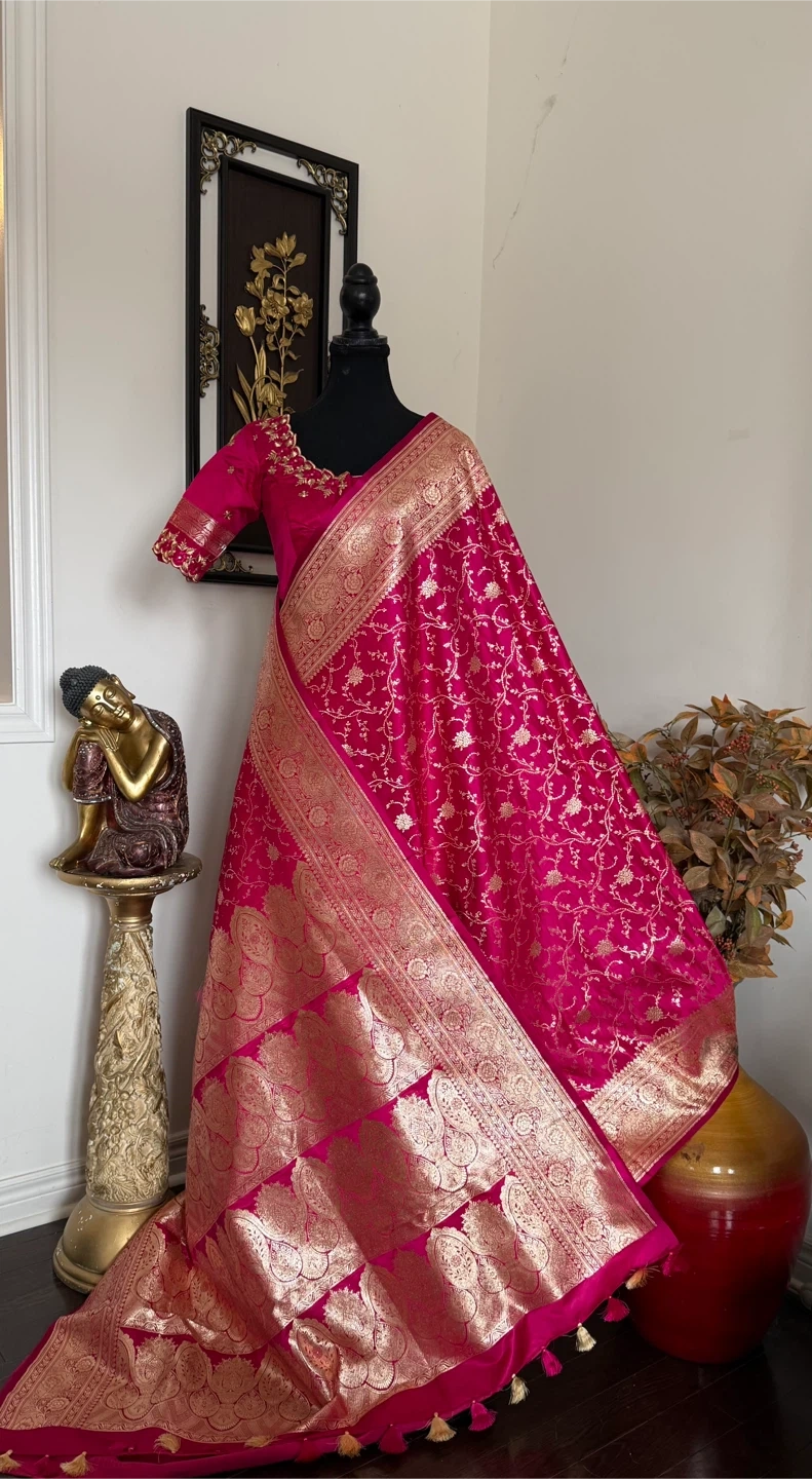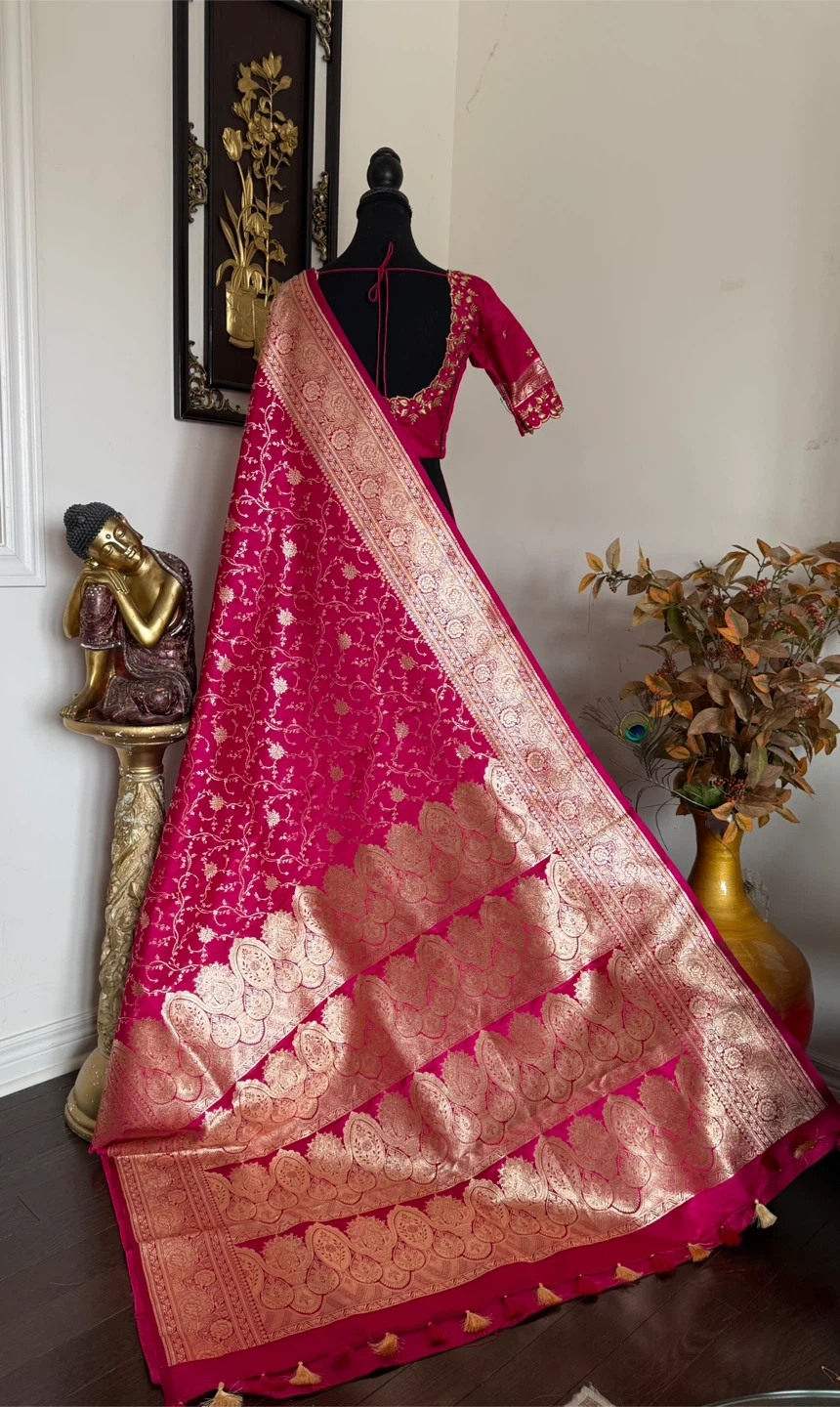 Gorgeous hot pink silk saree featuring intricate gold brocade weaving along the border and throughout the fabric. The blouse is embellished with delicate gold embroidery. Perfect for special occasions!