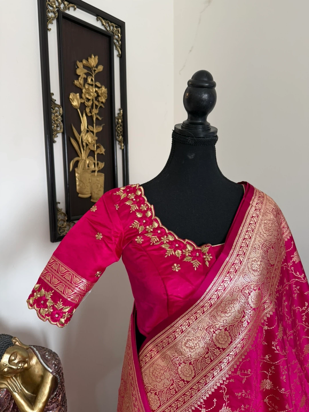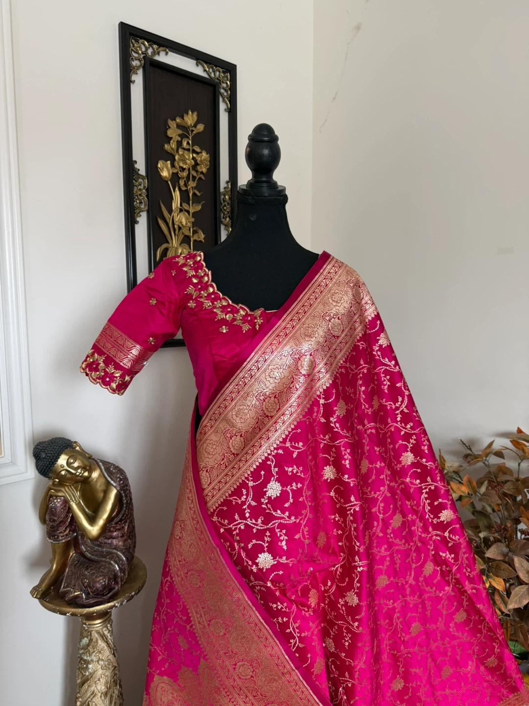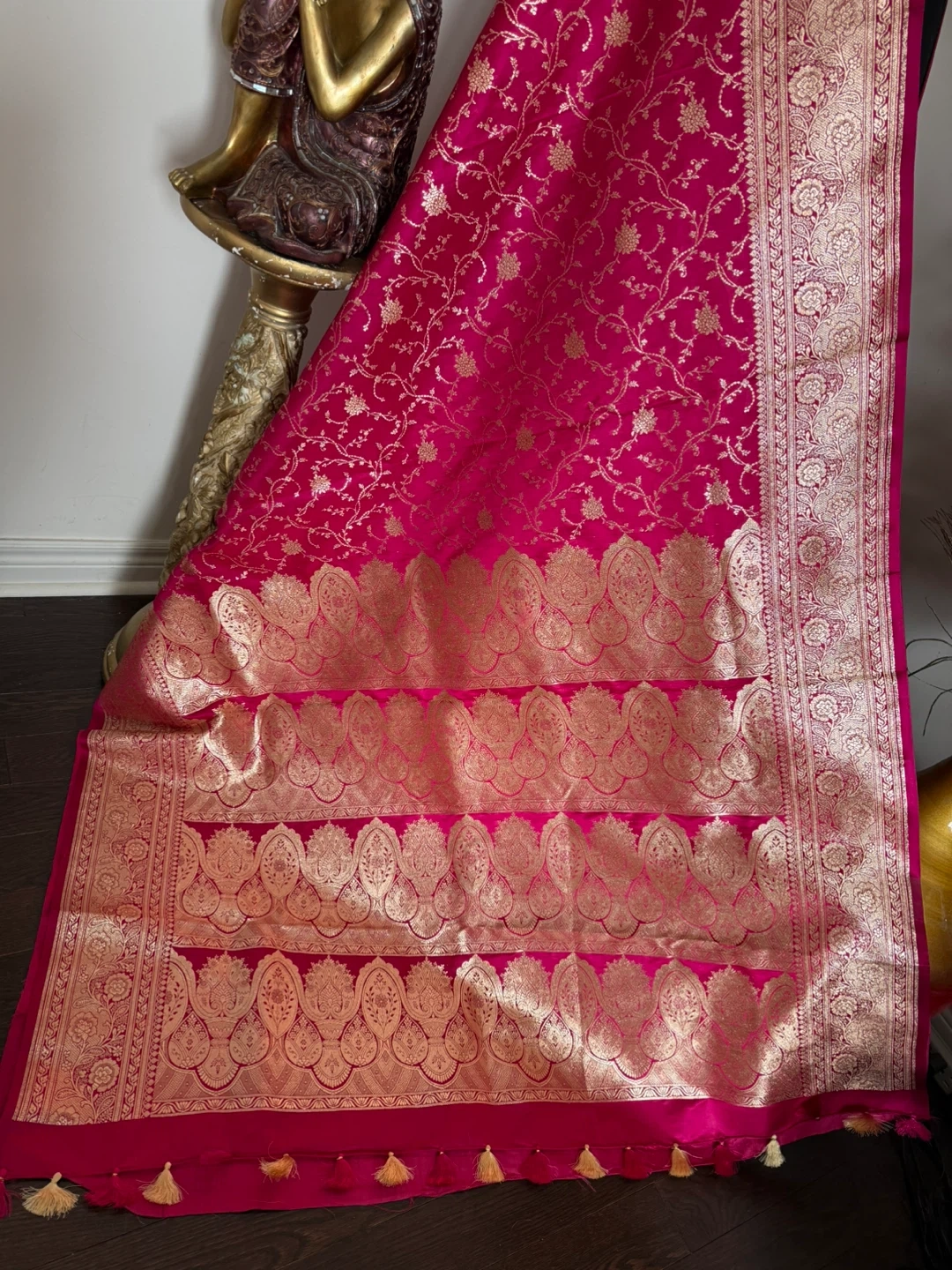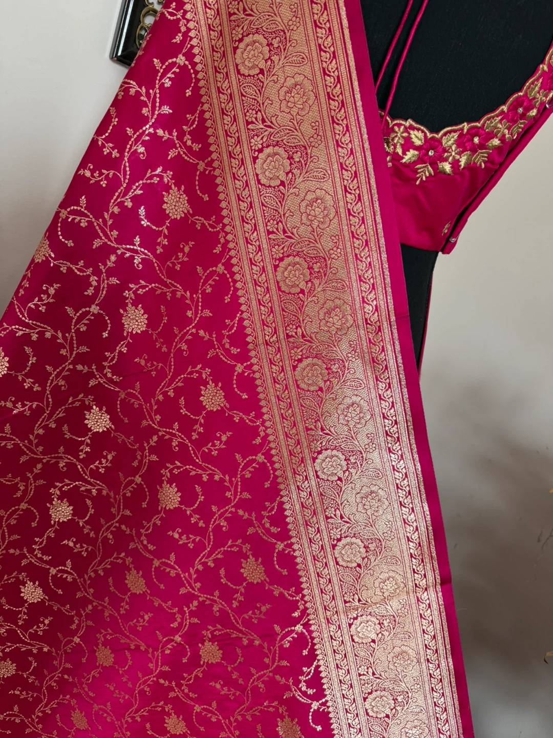 Gorgeous hot pink silk saree featuring intricate gold brocade weaving along the border and throughout the fabric. The blouse is embellished with delicate gold embroidery. Perfect for special occasions!