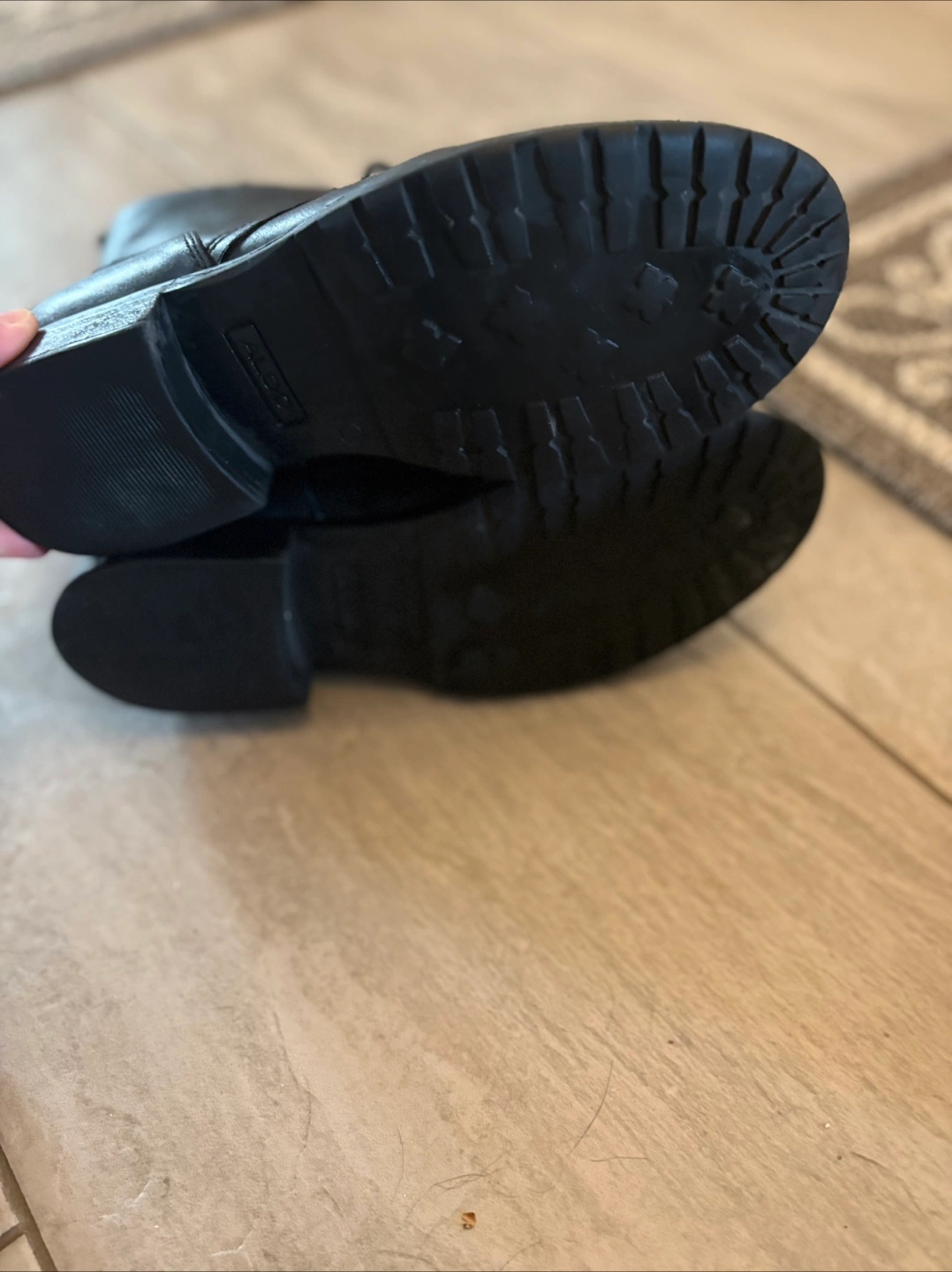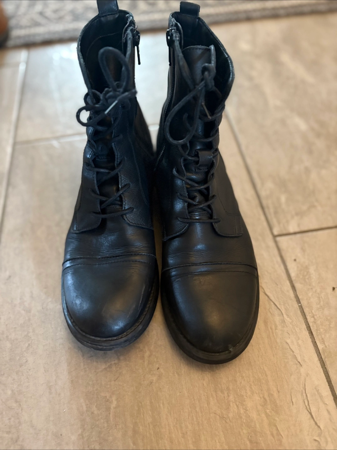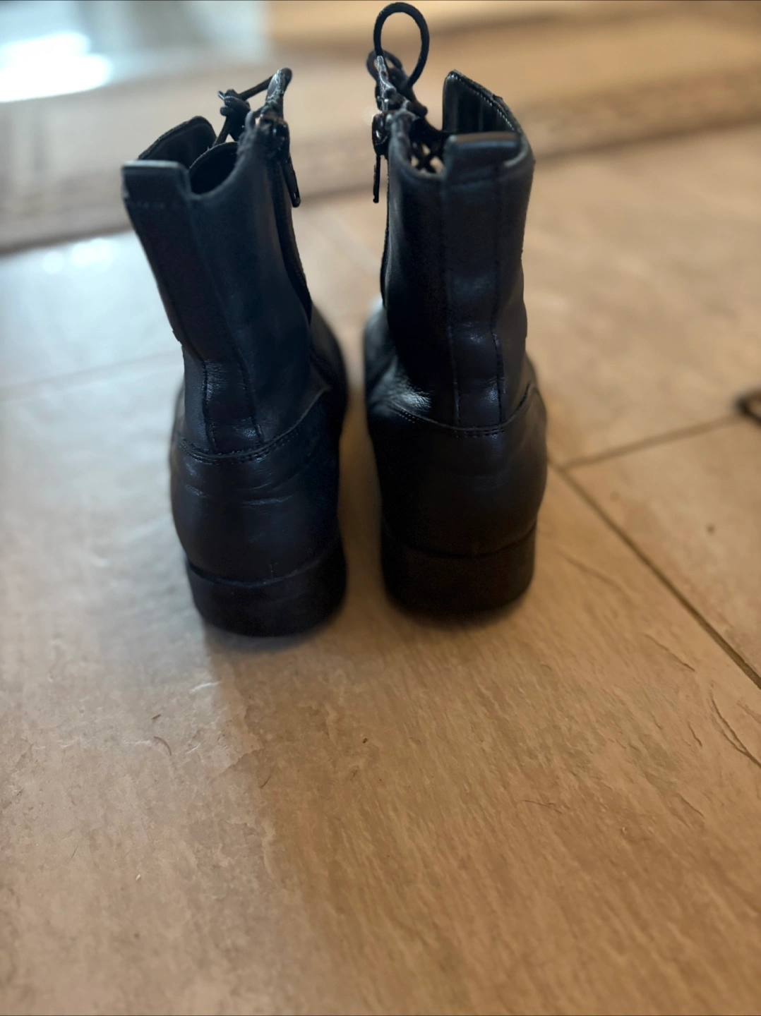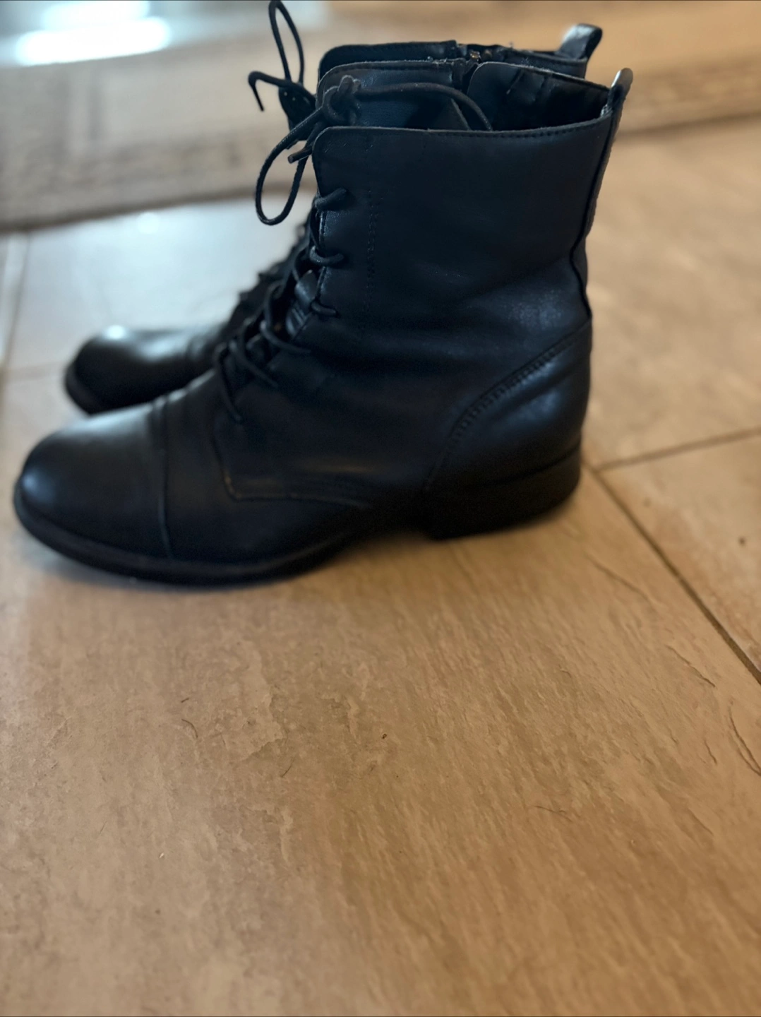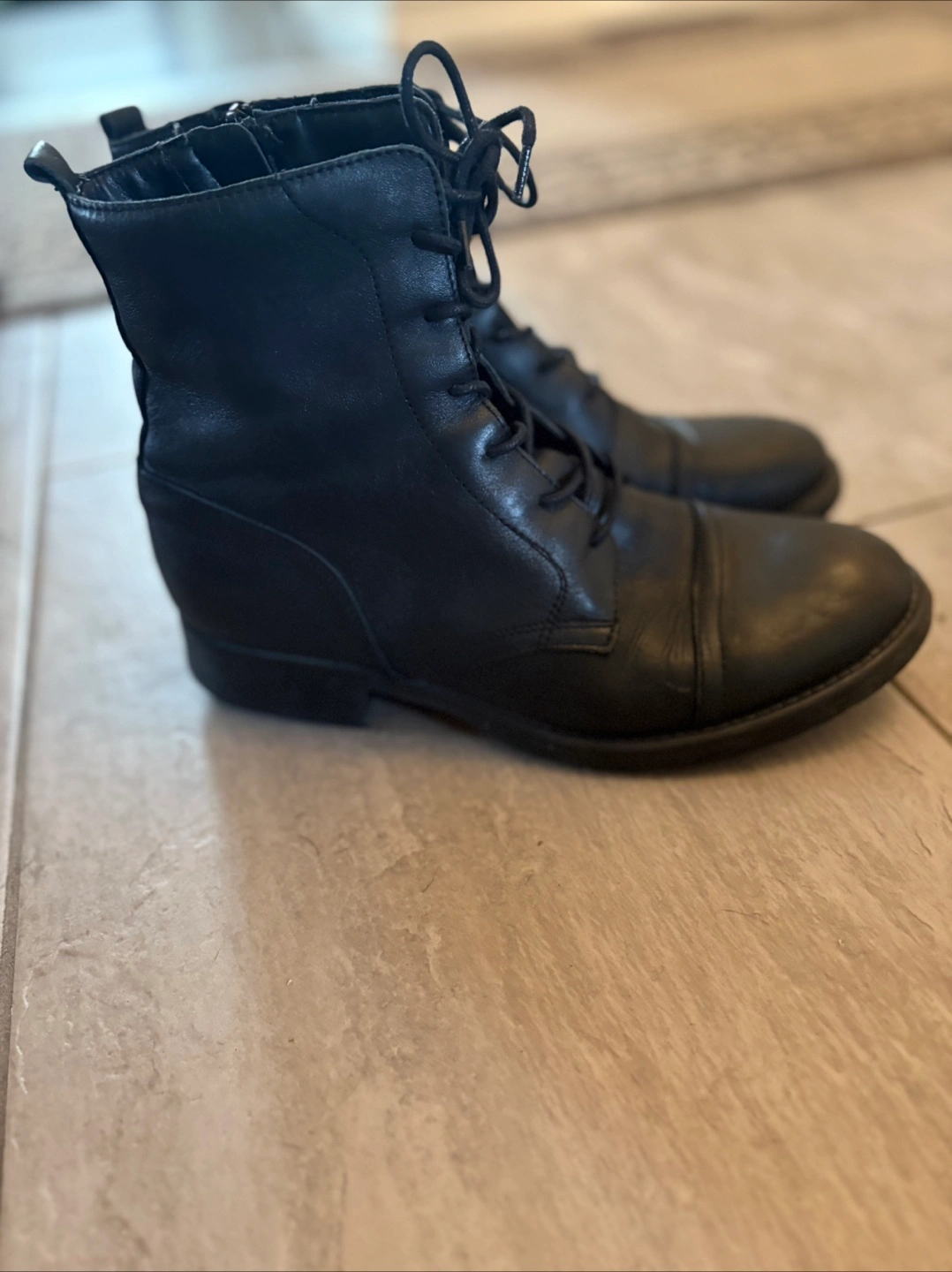 Women's black leather ankle boots. Lace-up closure and side zipper. Low block heel. Good for everyday wear. Good condition. Size 8.5.