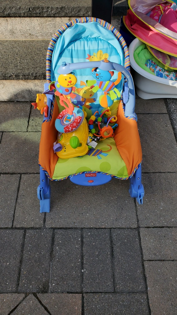 Great rocker. can be adjusted in the back for baby to sit up of lay down. We are cleaning up baby stuff and want it gone. Fisher price costs 50 new plus 2 baby toys as well