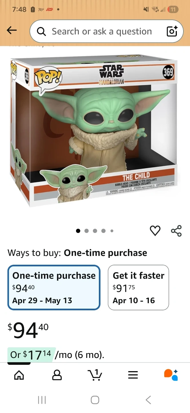 Buy & SellFunko Pop! Star Wars The Child 369 10"Funko Pop! Star Wars The Child 369 10"$60This is a Funko Pop! figure of 'The Child' from Star Wars: The Mandalorian. It's model number 369. Brand new in box. Box has minor damage.WHERE TO MEEThurontario and sandalwood pkwyView MapSELLERverifiedStanHeart Lake W963 reviews0 chats·0 favorites·3 viewsSEND CHAT TO SELLERHi Stan! I’m interested in your listing.Hi Stan! I’m interested in your listing.Get the Karrot app to chatSign In to chat
