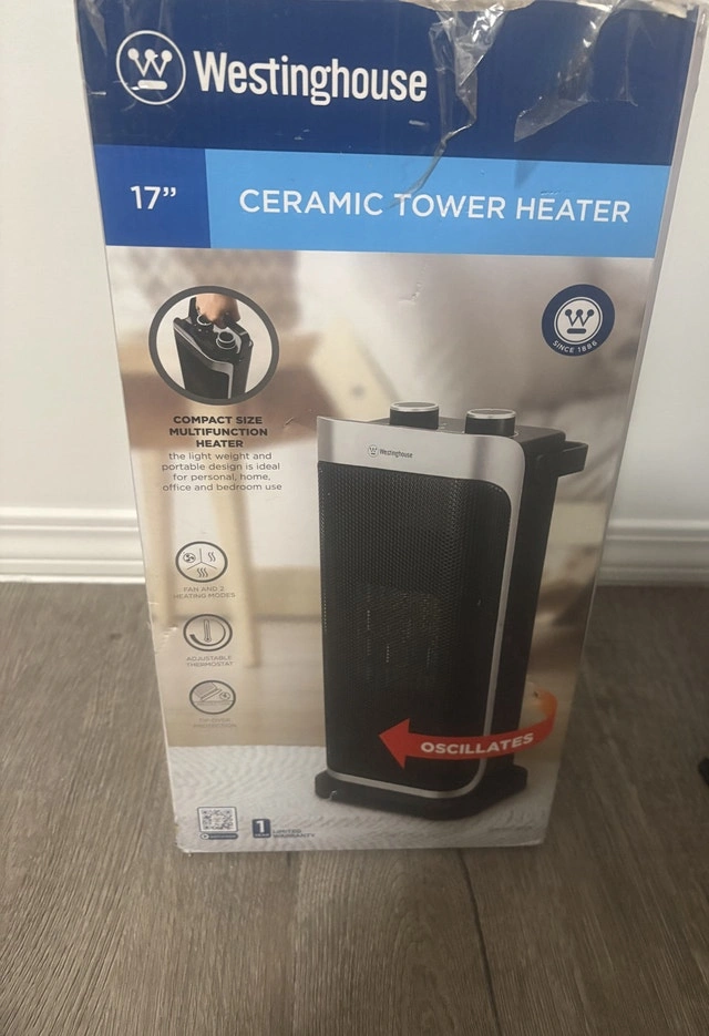 This Westinghouse 17" ceramic tower heater is compact, lightweight, and portable, making it ideal for personal use at home, in the office, or in the bedroom. It features fan and 2 heating modes, an adjustable thermostat, and an oscillating function. Specifications: * Compact size * Multifunction heater * Fan and 2 heating modes * Adjustable thermostat * Oscillating function