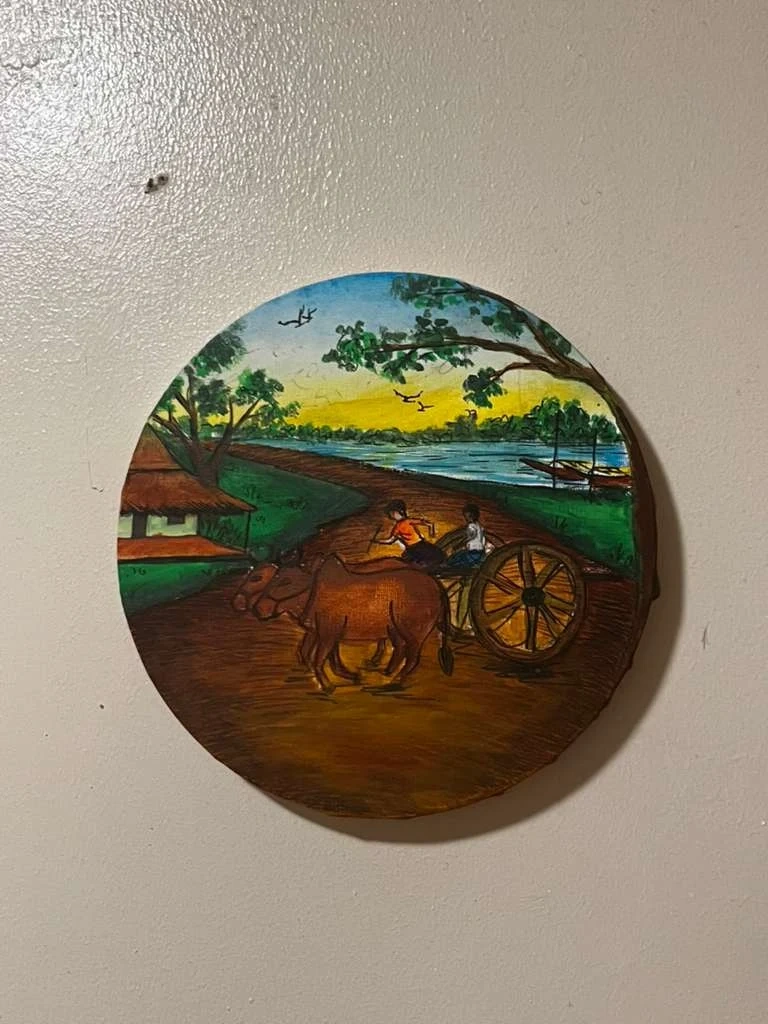 This is a unique, hand-painted circular wooden plaque depicting a village scene with a bullock cart. It features a vibrant landscape with a river, trees, and a house. It's a lovely piece for home decor. Measures approximately 10 inches in diameter.