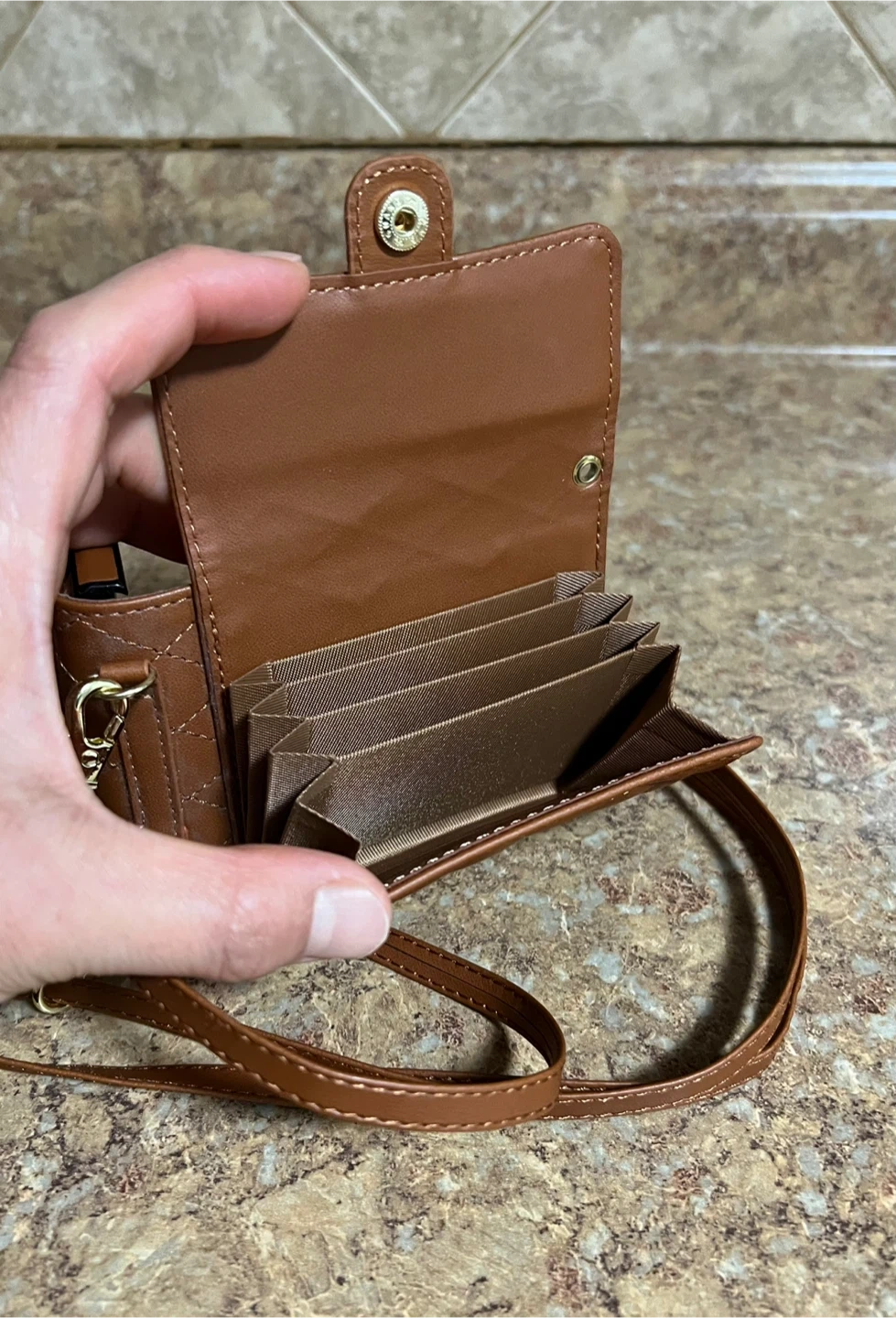 This is a brown quilted phone case wallet with a strap. It has a quilted design and a button closure. Inside, there are several slots for cards. The strap is adjustable. It's in great condition!