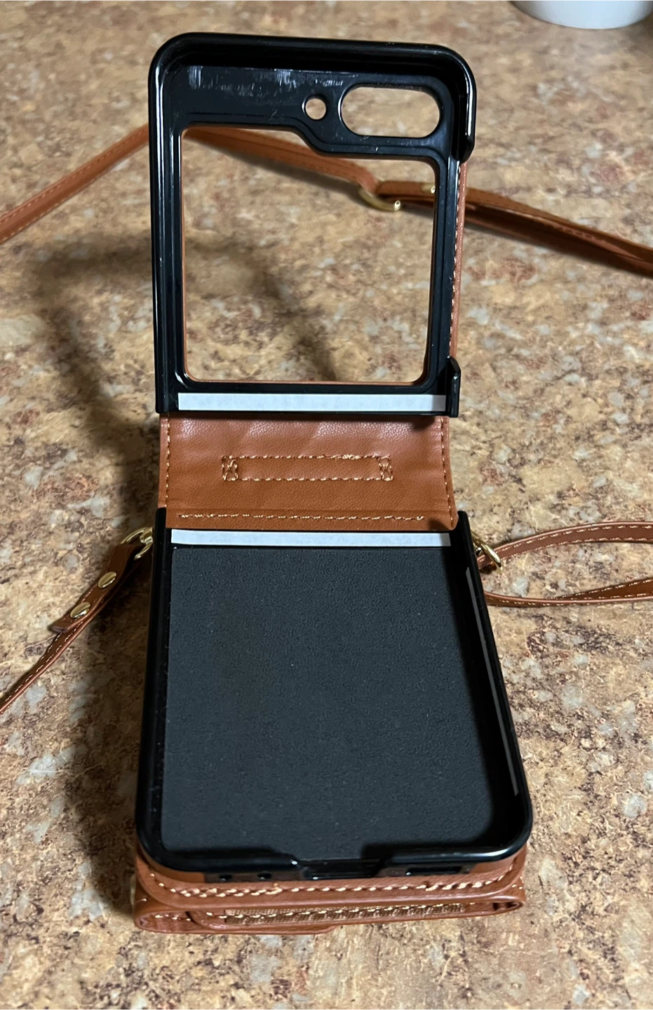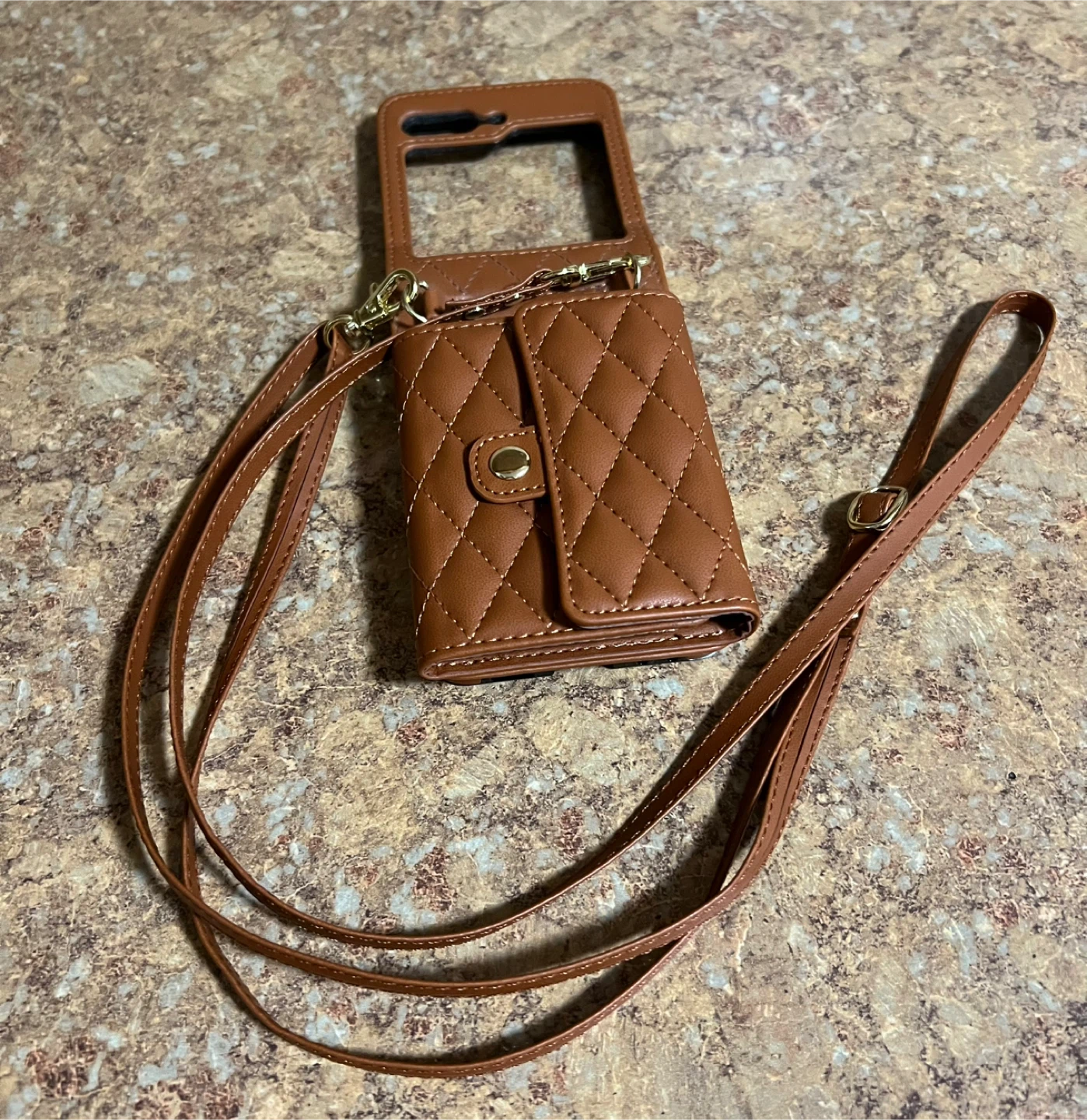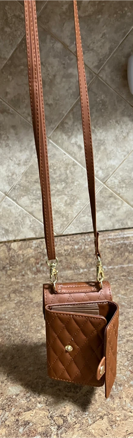 This is a brown quilted phone case wallet with a strap. It has a quilted design and a button closure. Inside, there are several slots for cards. The strap is adjustable. It's in great condition!