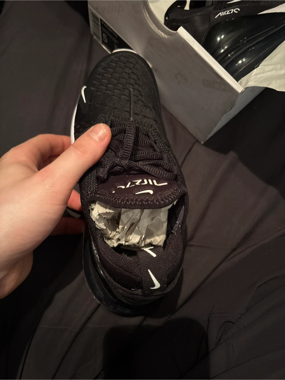 Women's Nike Air Max 270 sneakers in black, anthracite, and white. Original box included. Size 5 (UK 2.5, CM 22, EUR 35.5). Never worn, original box.
