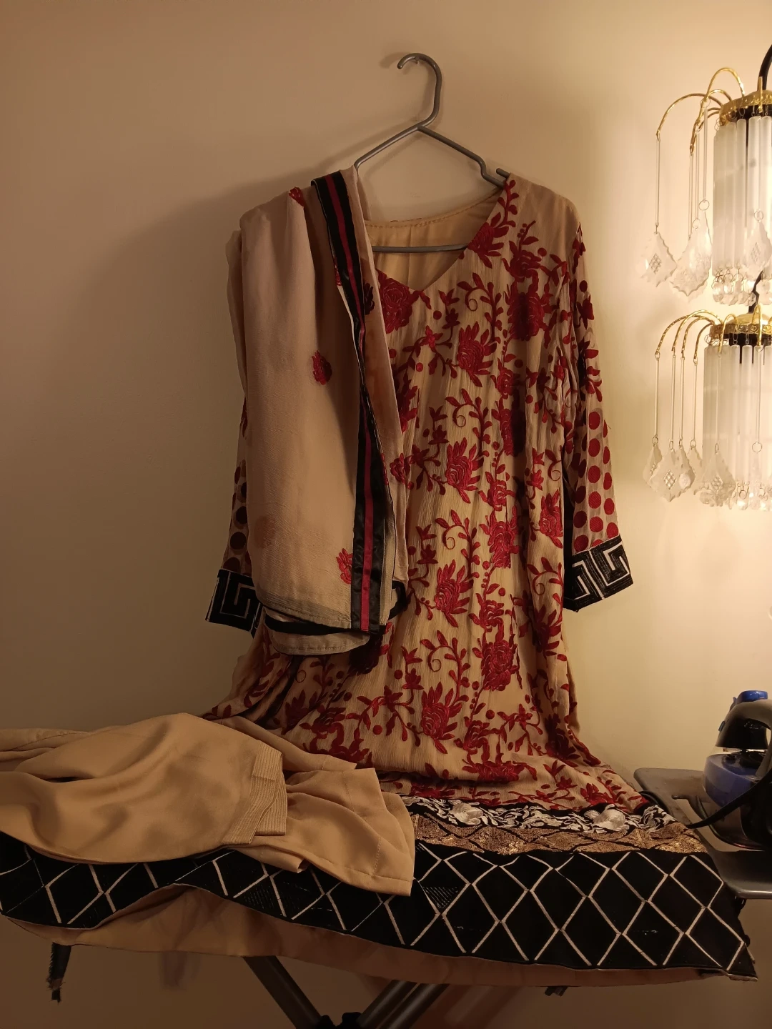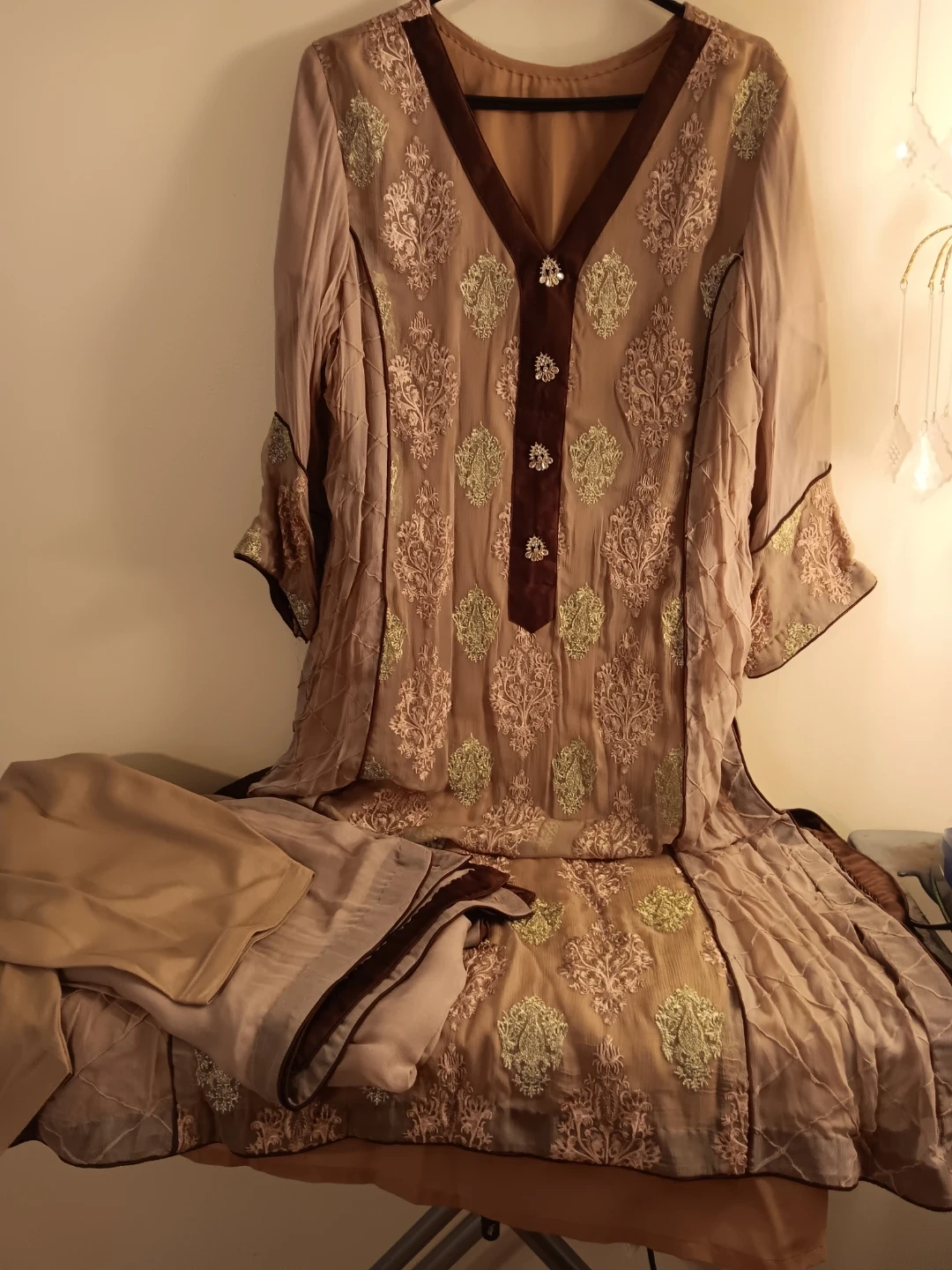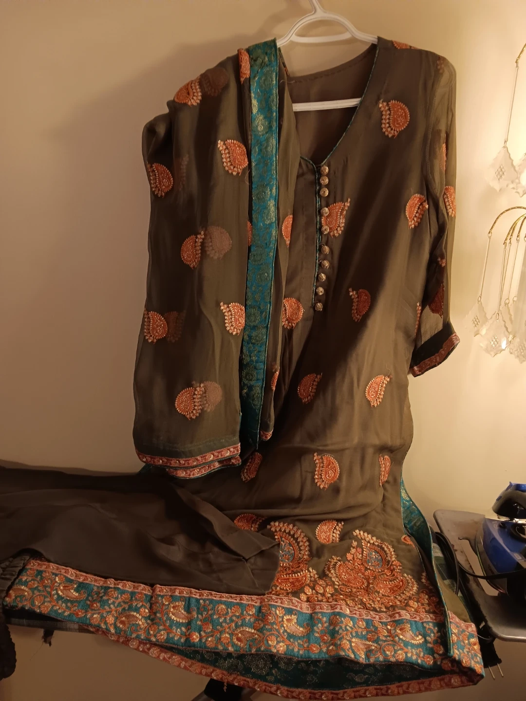Embroidered kameez shalwar suit. Features intricate embroidery on the neckline and hem. Comes with a matching dupatta. Perfect for cultural events!