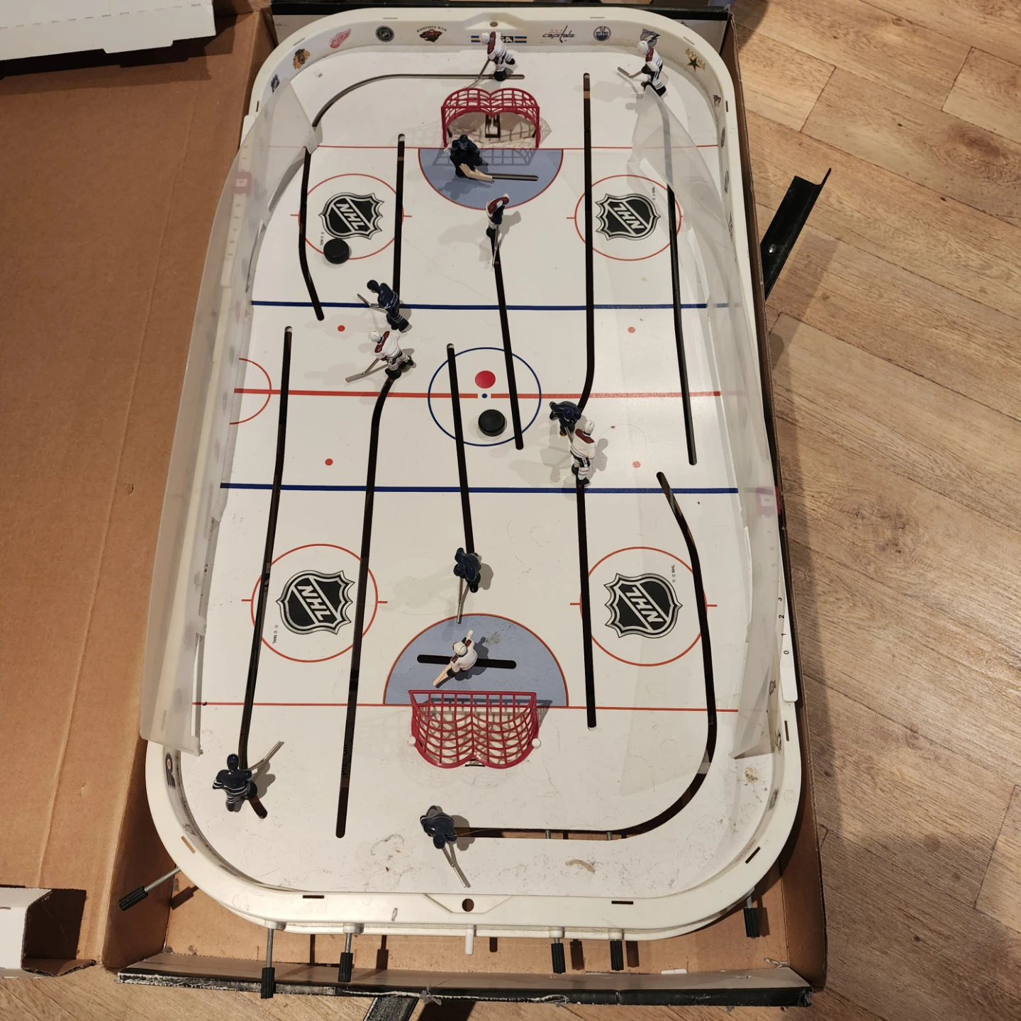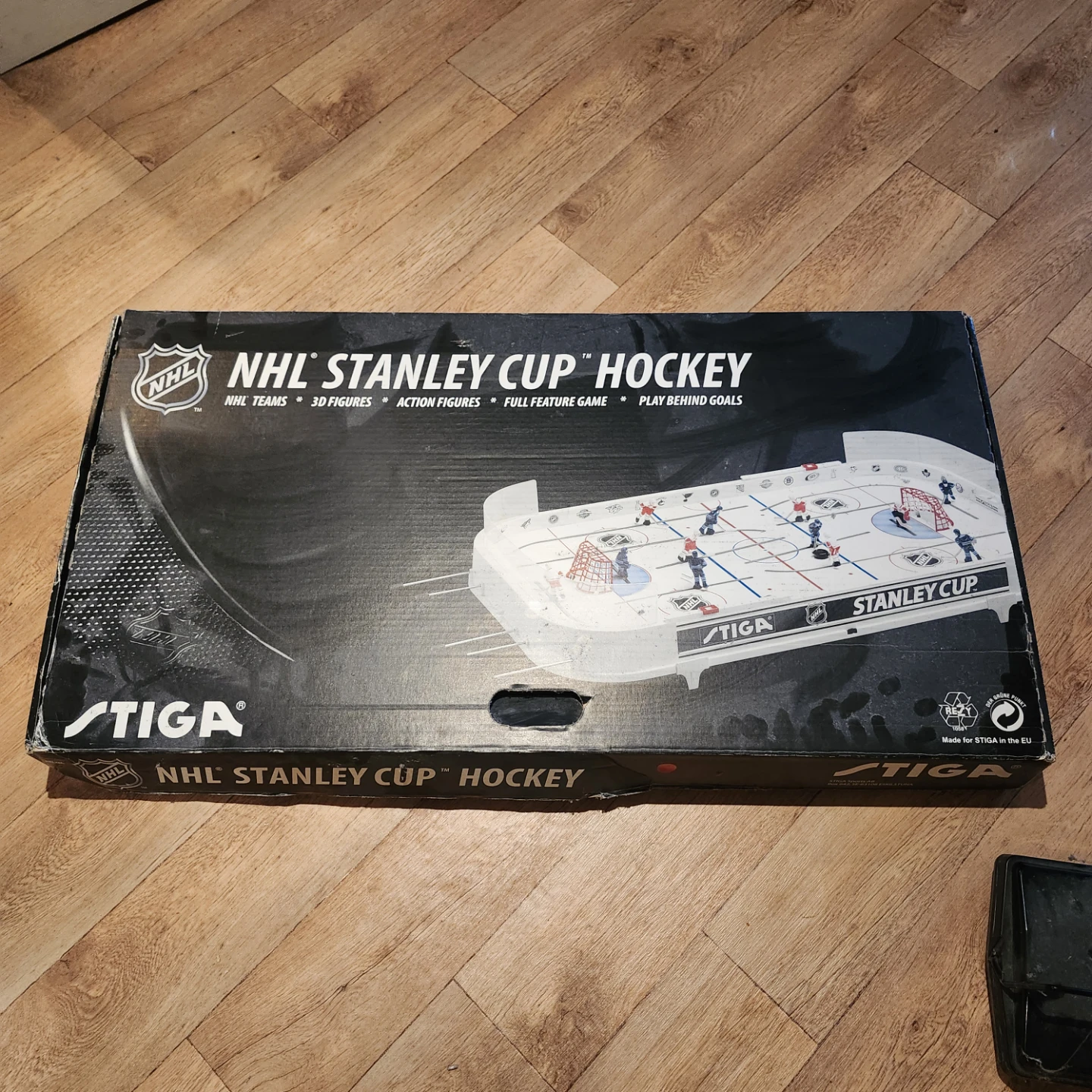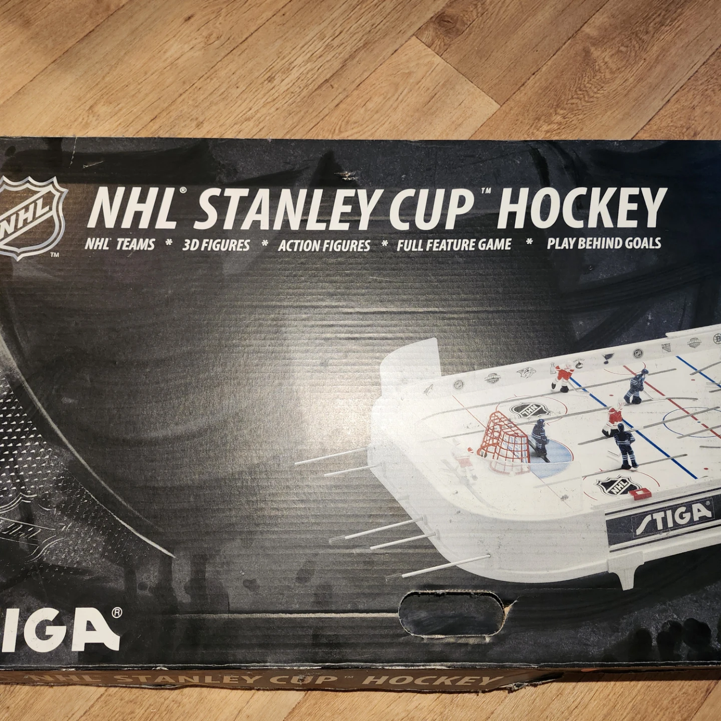 This is a STIGA NHL Stanley Cup Hockey game. It comes with 3D action figures and play behind the goals. It's a full feature game for hockey fans! Used a small crack on one side, all pieces included. New sells for $250.