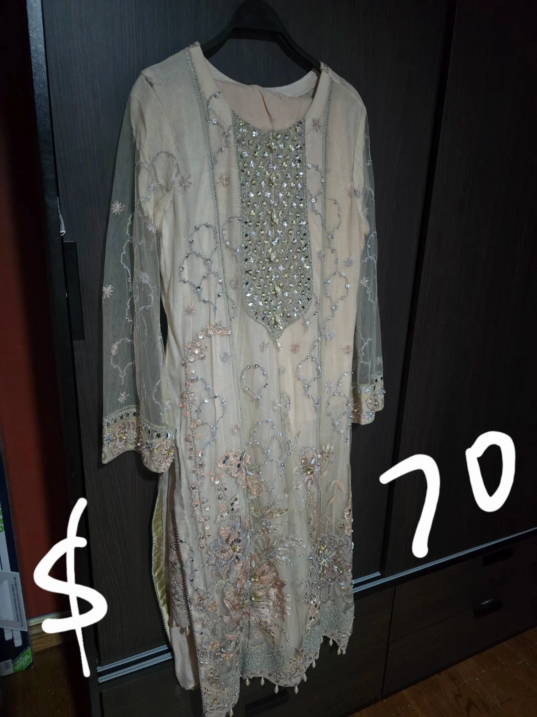 Beautiful beige 3 piece with intricate beadwork and sequin embellishments on the neckline and sleeves. Sheer sleeves with embroidered cuffs. Perfect for special occasions or festive wear!