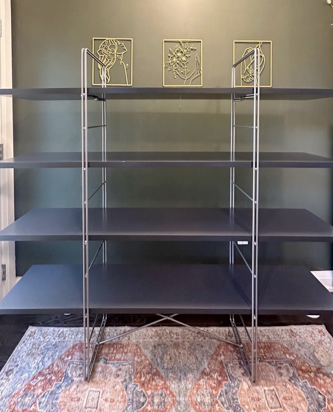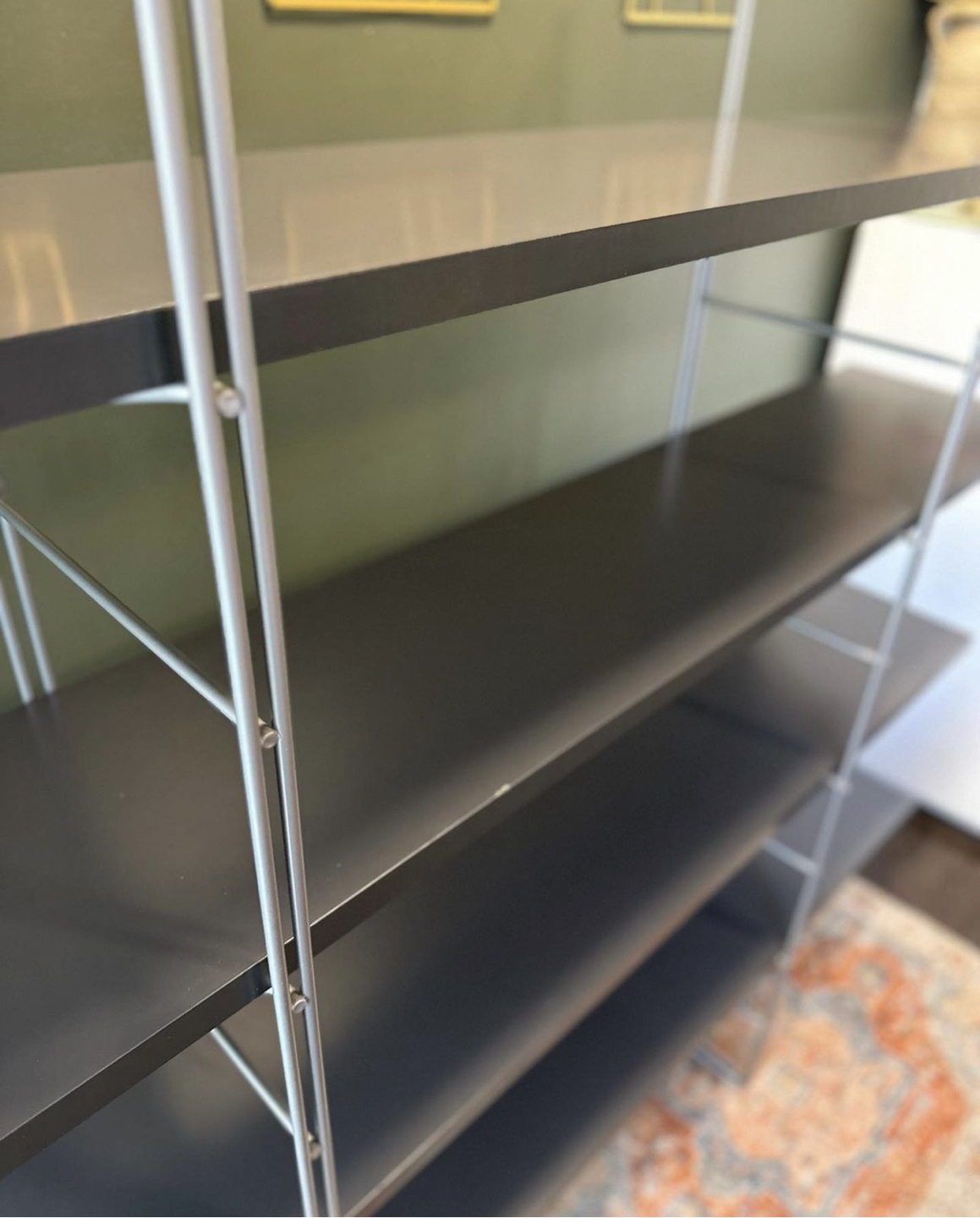 Enetri Ikea shelf designed in the 1980s by Niels Gammelgaard. Structured with steel wire ladders with four veneer oakwood laminated shelves (dark charcoal grey color).