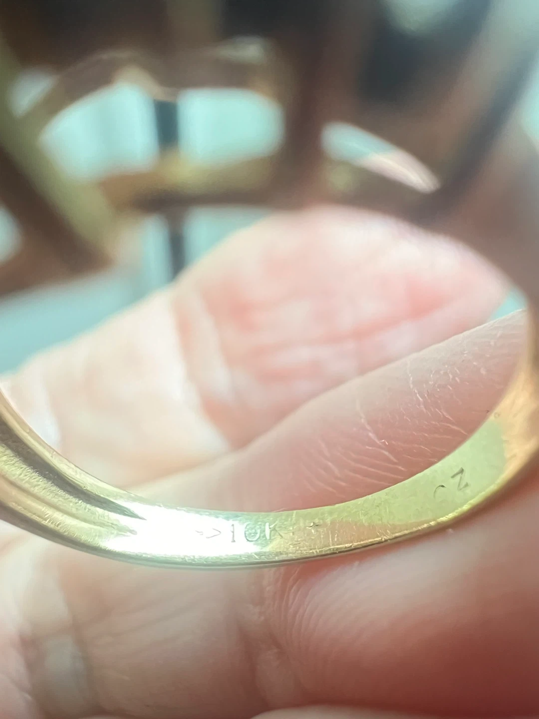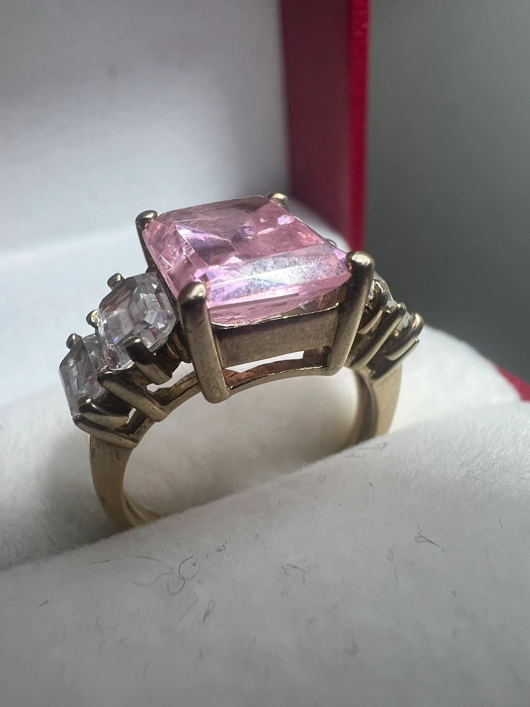 This ring features a central rectangular pink ice gemstone flanked by two clear rectangular gemstones. The band is stamped 10K. It's a lovely statement piece!