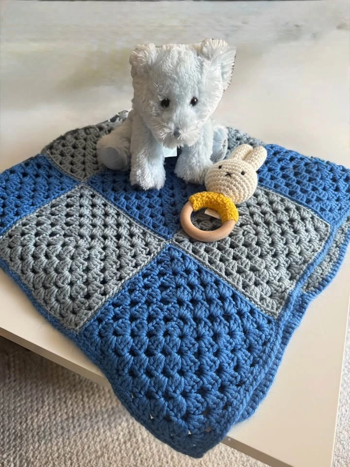 Handmade baby blanket used twice. Gently used Shining Stars blue bear. Just Dutch teether, never chewed on. All items are like new. Asking $30 for all.