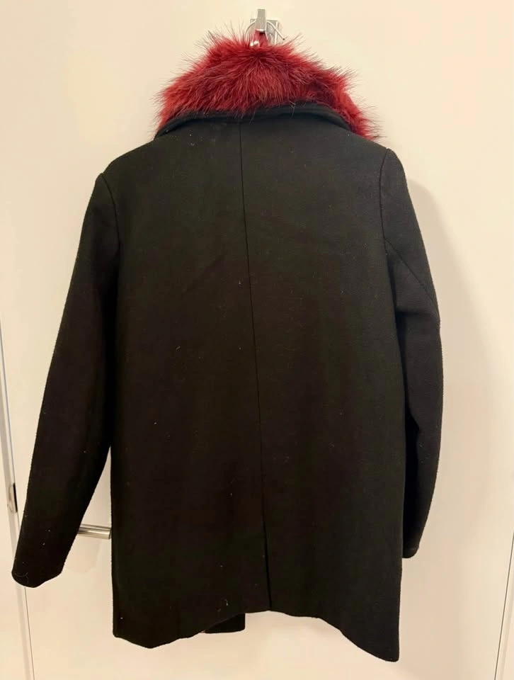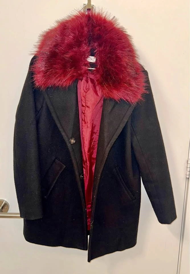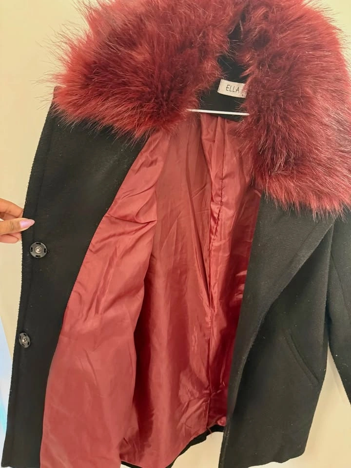 Elegant black wool blend coat with a bold burgundy/red faux fur collar and red satin lining. Stylish, warm, and perfect for fall or winter.