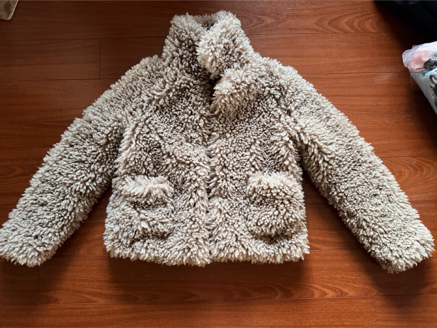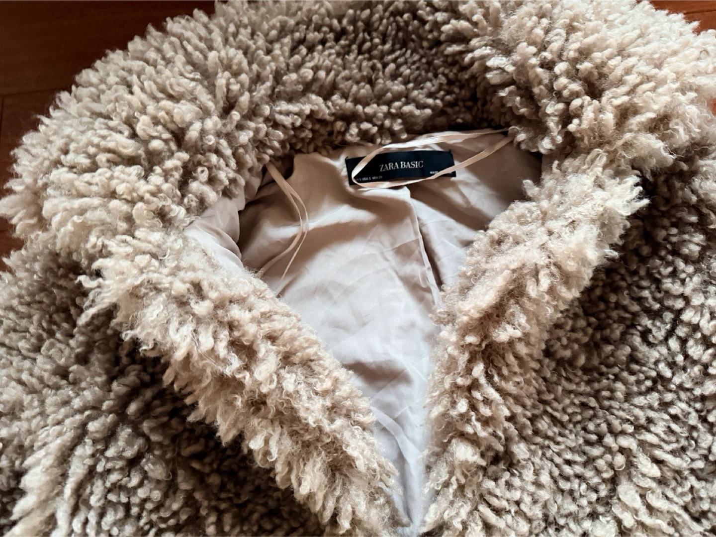 Cozy beige fuzzy jacket from Zara Basic. It's a comfortable and stylish outerwear piece. Two front pockets are included.