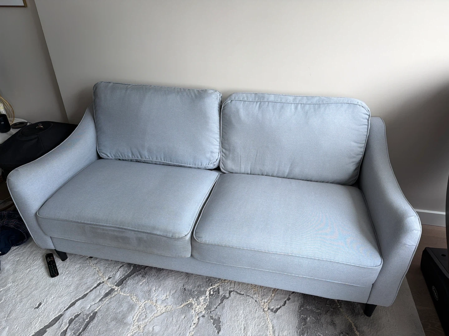 A light gray fabric sofa. It features two seat cushions and two back cushions. Fabric material.we purchased around two years ago,and we don’t have any pet😉!