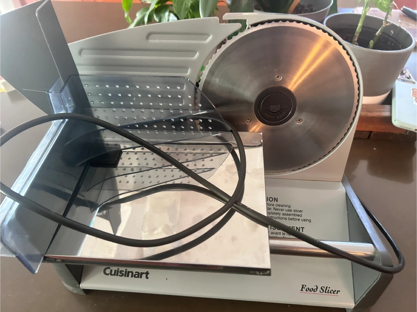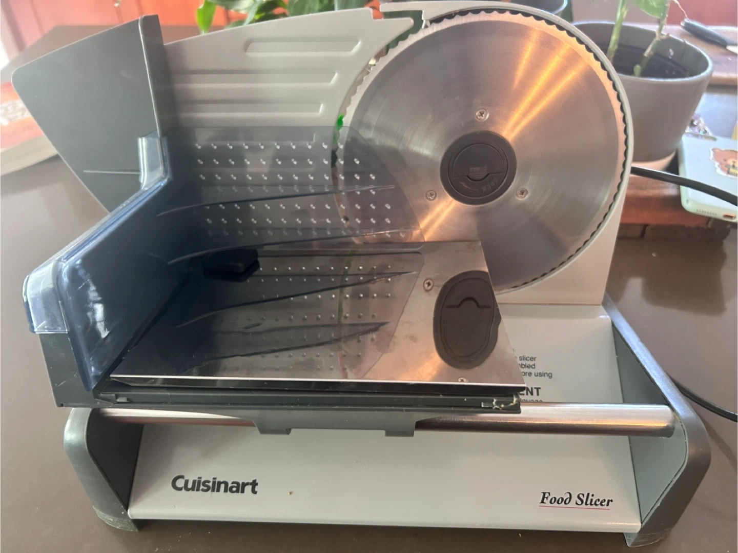 This Cuisinart food slicer is ready for use. It features a stainless steel blade for efficient slicing. This slicer is great for preparing meats and cheeses at home.