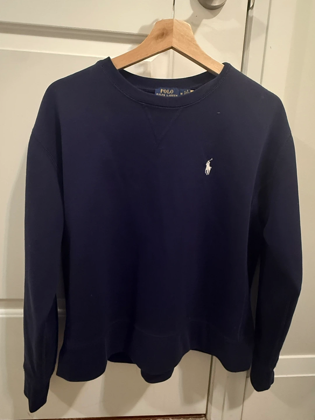 Selling a Polo Ralph Lauren sweatshirt in navy blue. It's a size medium and in great condition! The classic Polo logo is embroidered on the front. Perfect for layering or wearing on its own