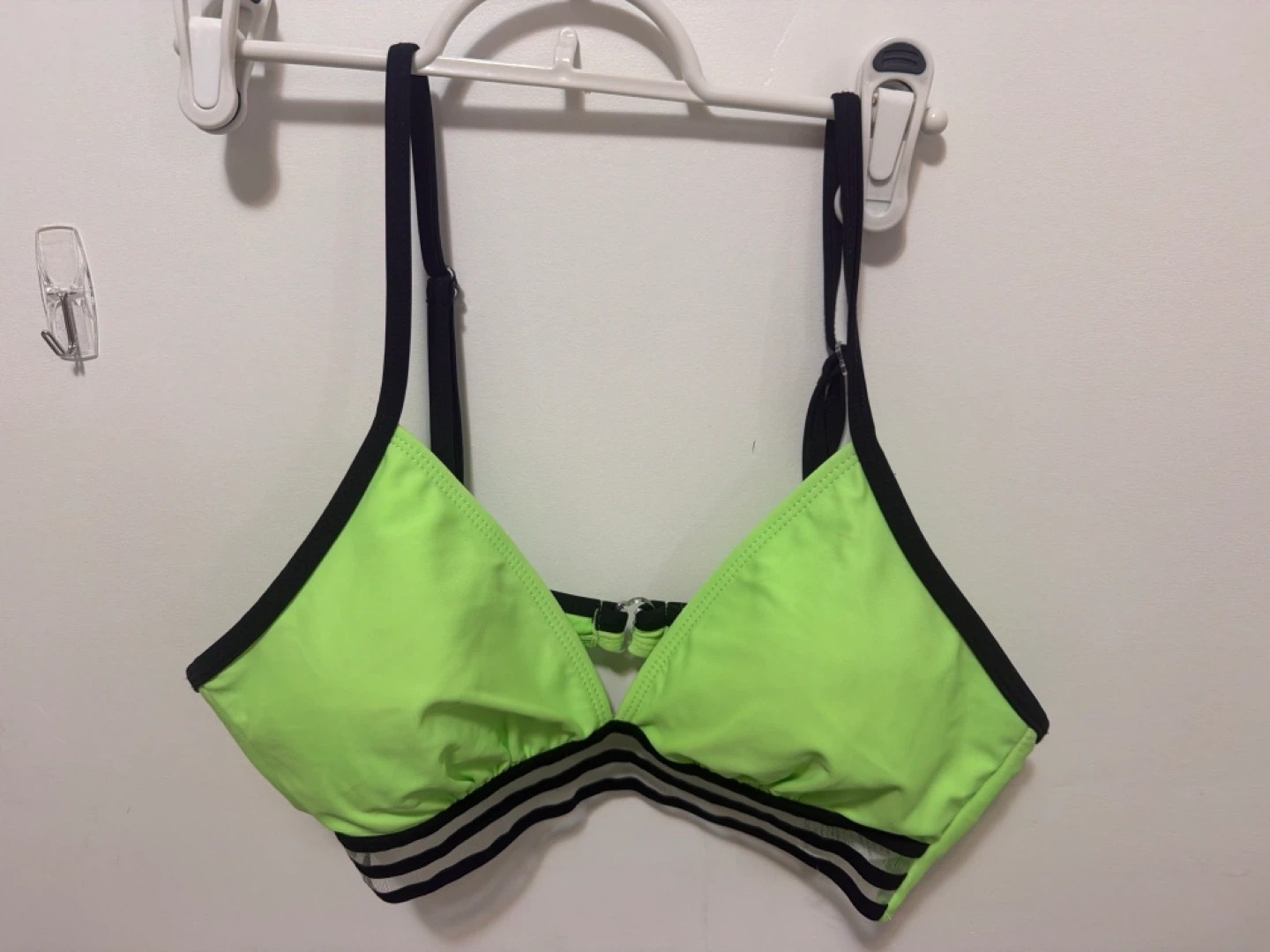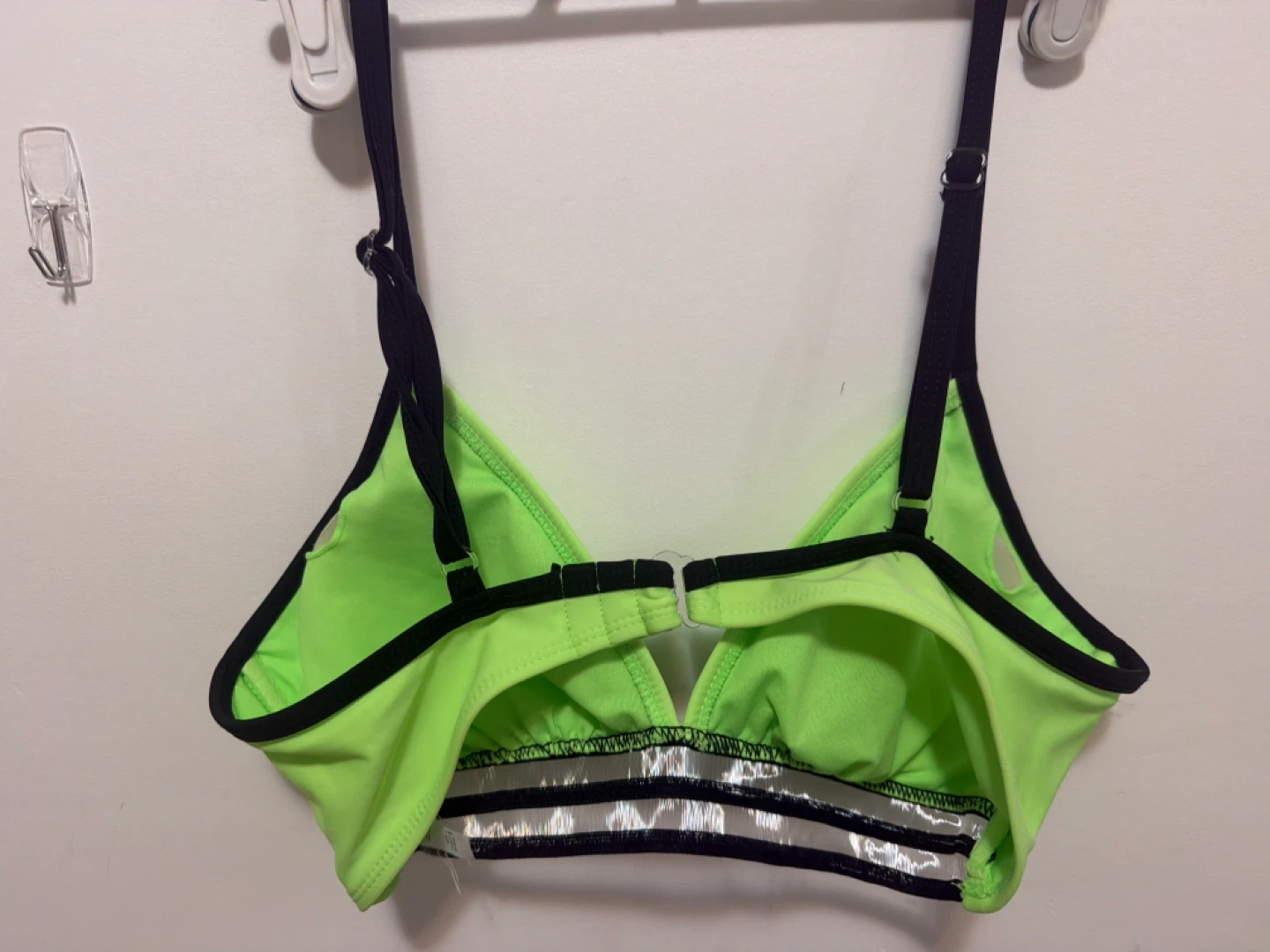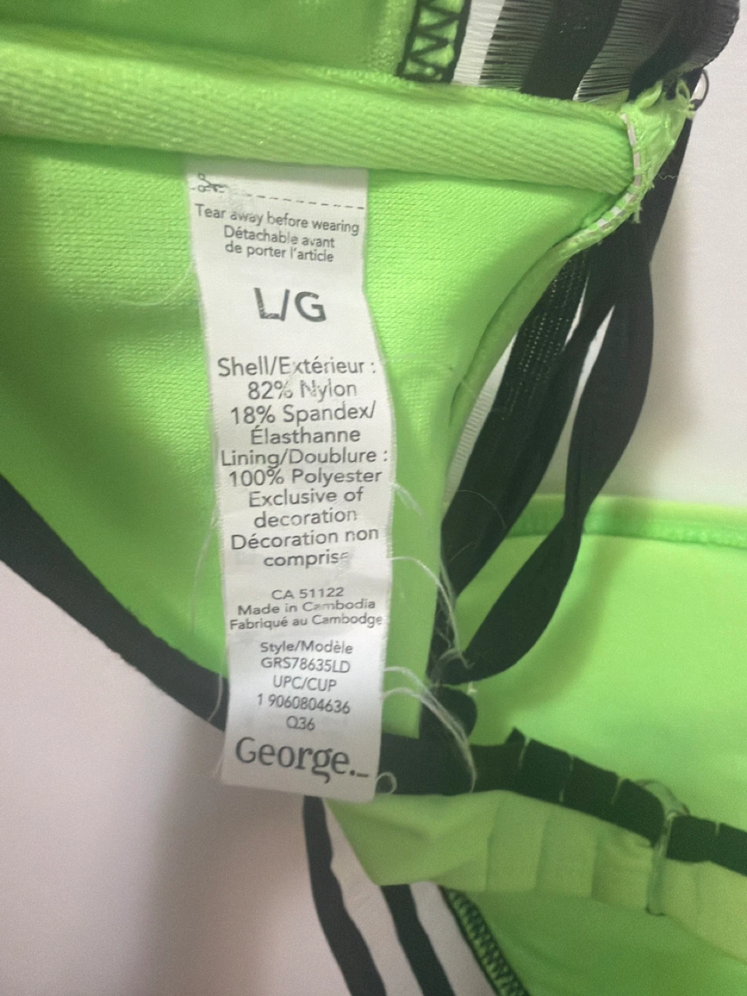 π Neon green bikini top with black trim. Shell is 82% Nylon and 18% Spandex. Lining is 100% Polyester. Made in Cambodia. This top is great for beach days or swimming! It's a size L/G