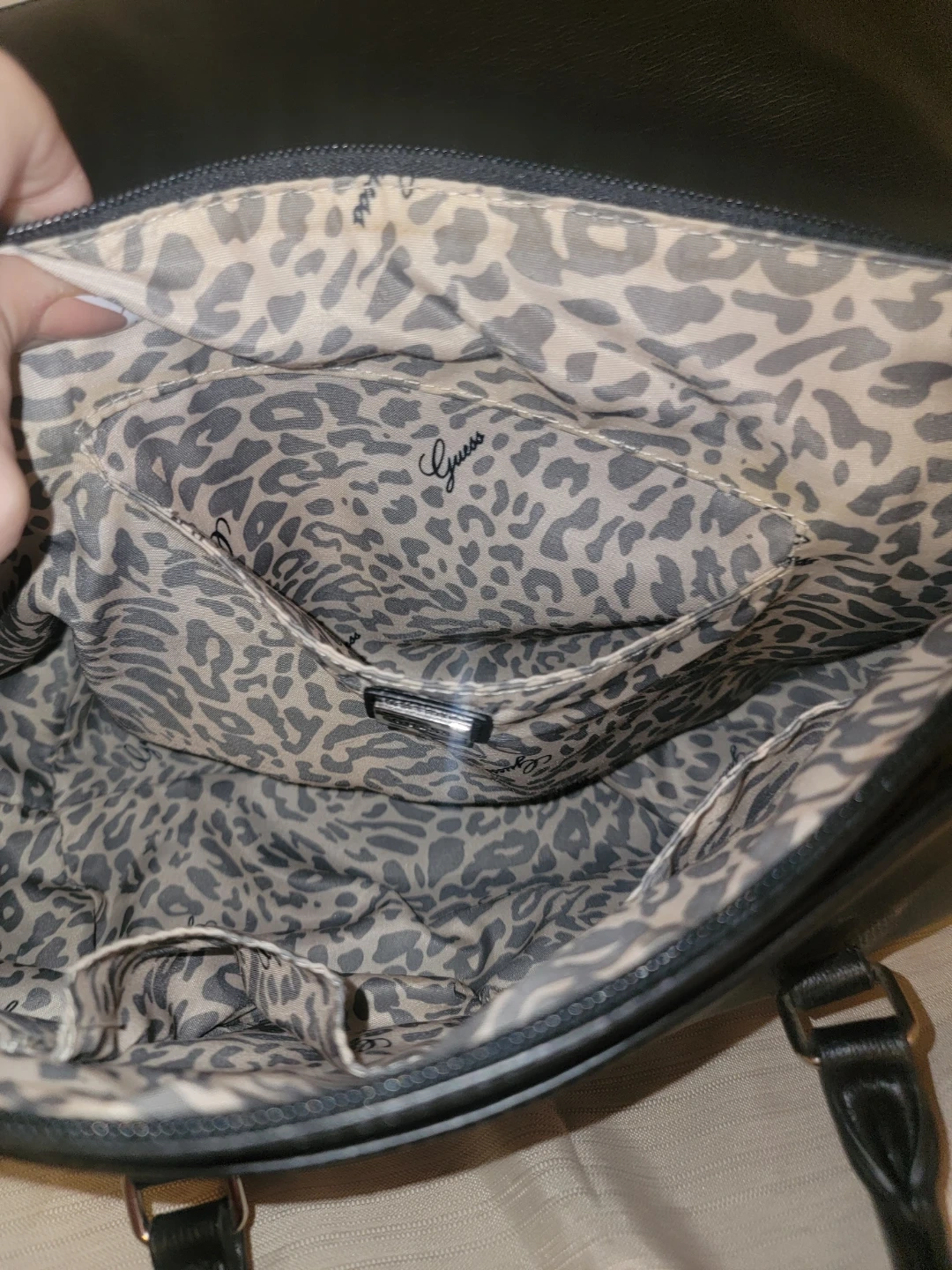 This Guess satchel handbag is black with silver stud details. It features a leopard print lining inside with multiple pockets. It's a stylish accessory for everyday use!