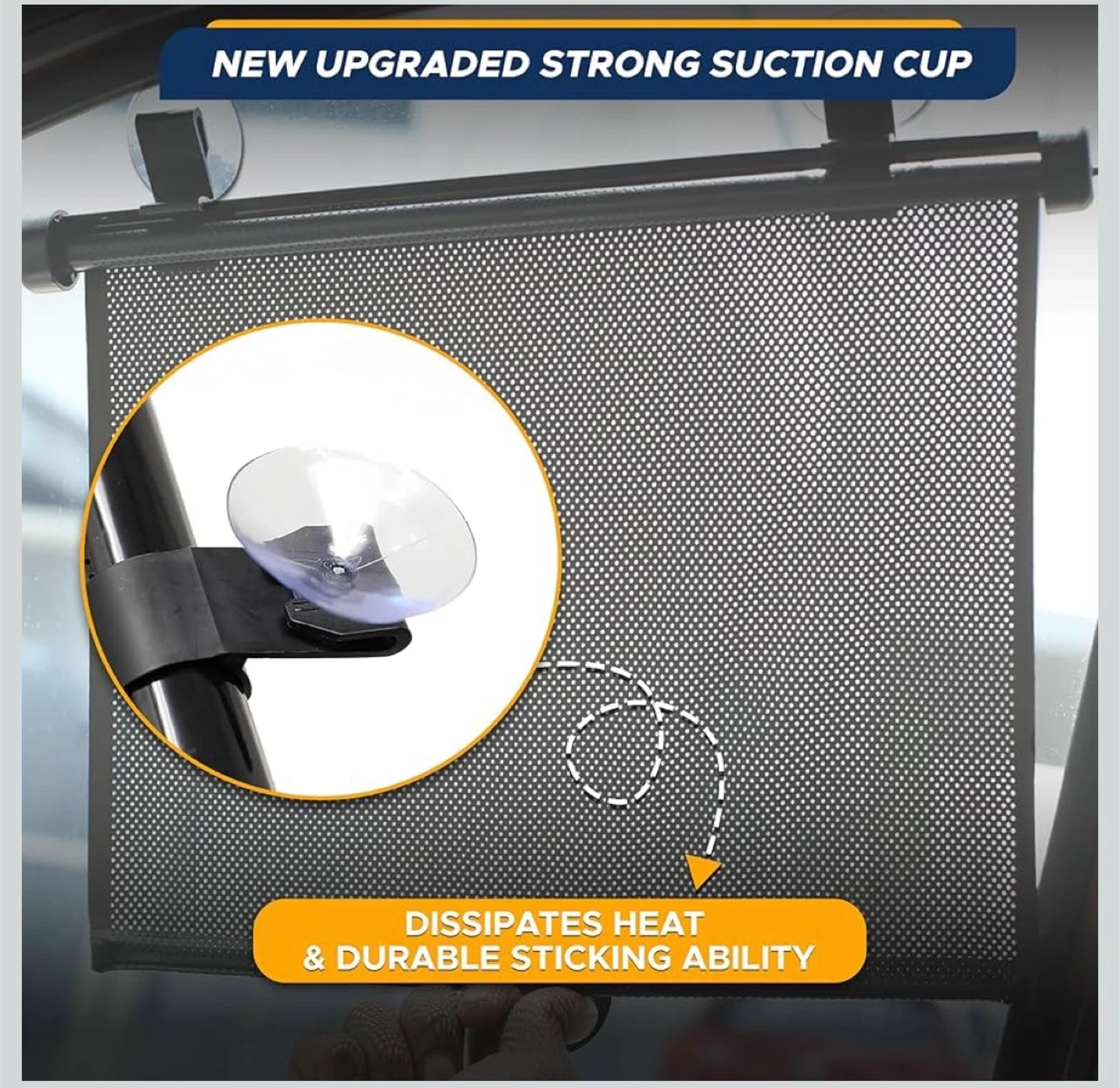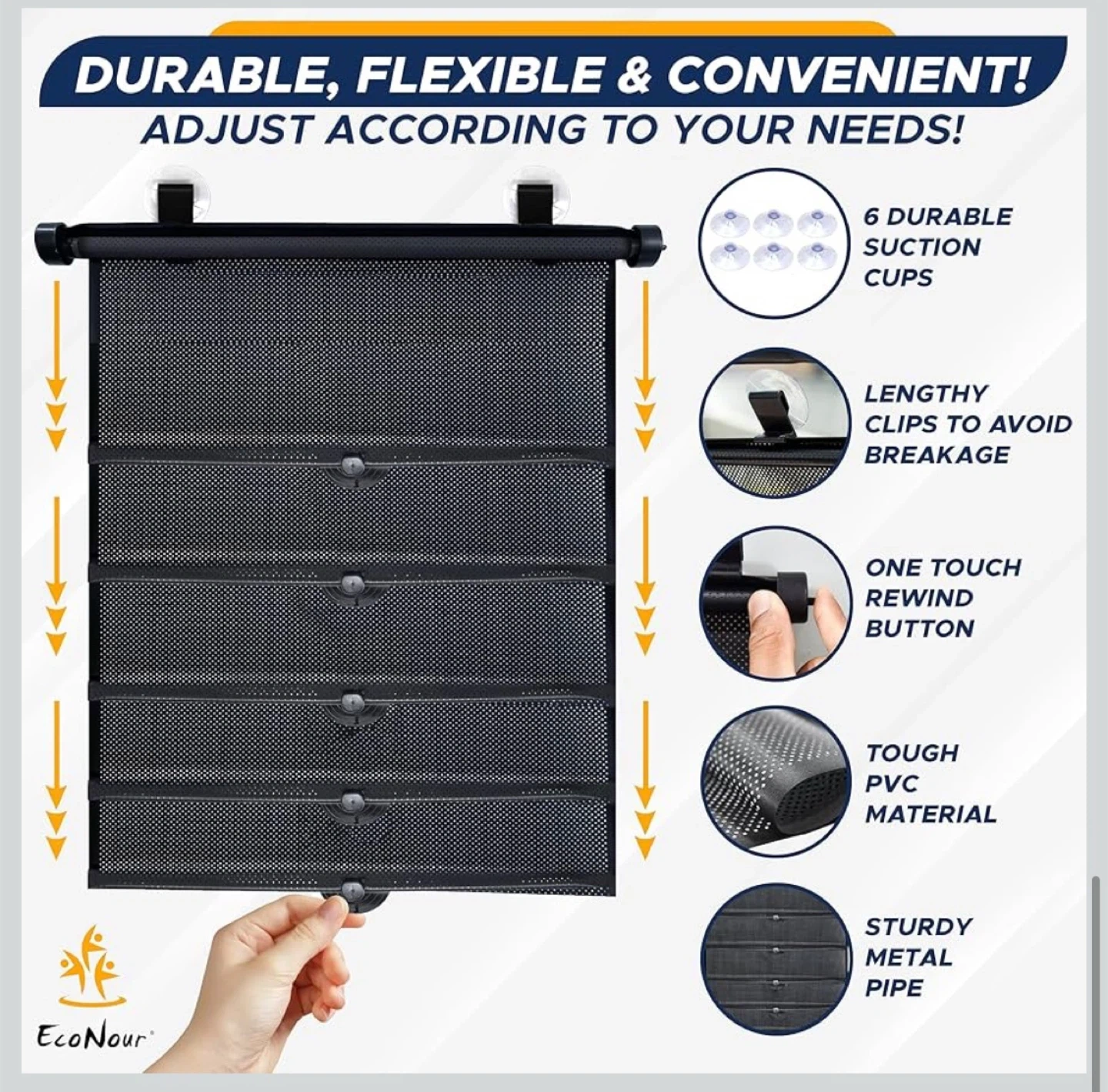 Upgraded Roller Shade: EcoNour's upgraded shade comes with 6 white suction cups to ensure strong suction cup that sticks to the car window until removed. The enhanced longer clips reduces the breakage while closing the window.