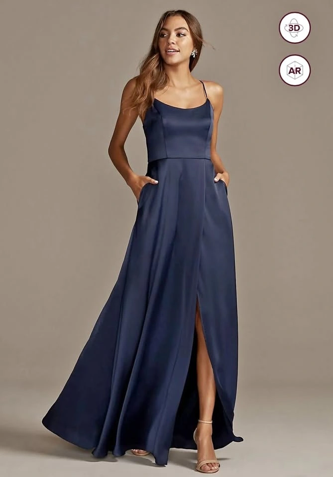 Radiate glamour in this clean-lined, crepe-back satin bridesmaid dress with a modern scoop neckline, flattering bodice seams, a sleek overlay, and a sexy skirt slit. The adjustable straps provide a perfect fit and handy side pockets are an easy place to keep lip gloss or emergency bobby pins.