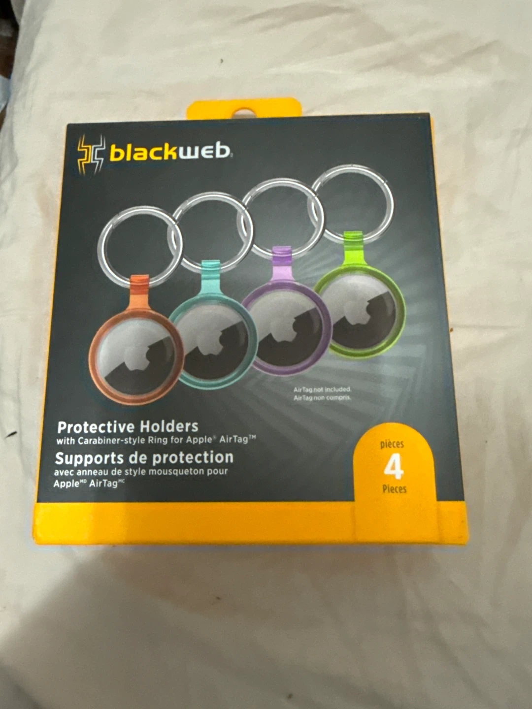 This is a 4-pack of Blackweb protective holders with carabiner-style rings, designed for Apple AirTag. They're made to protect your AirTags from scratches and drops. This set includes holders in multiple colours, perfect for keeping track of your belongings!