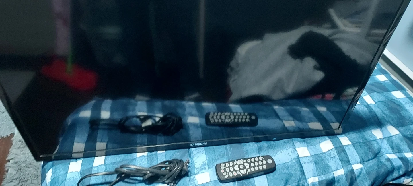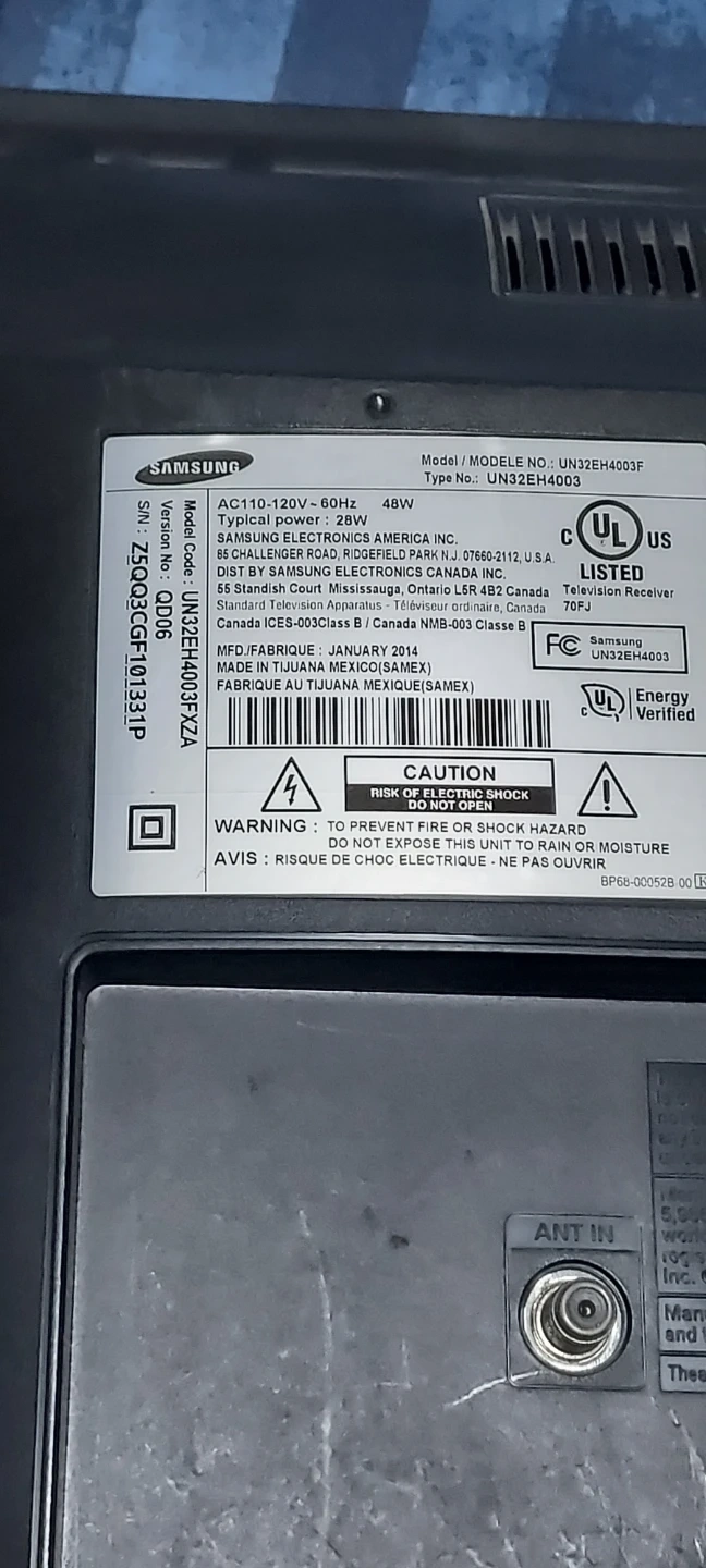 Samsung 32 inch HD television. Model UN32EH4003F. Manufactured January 2014. Includes two remotes and power cord. Features HDMI, USB, and component inputs.