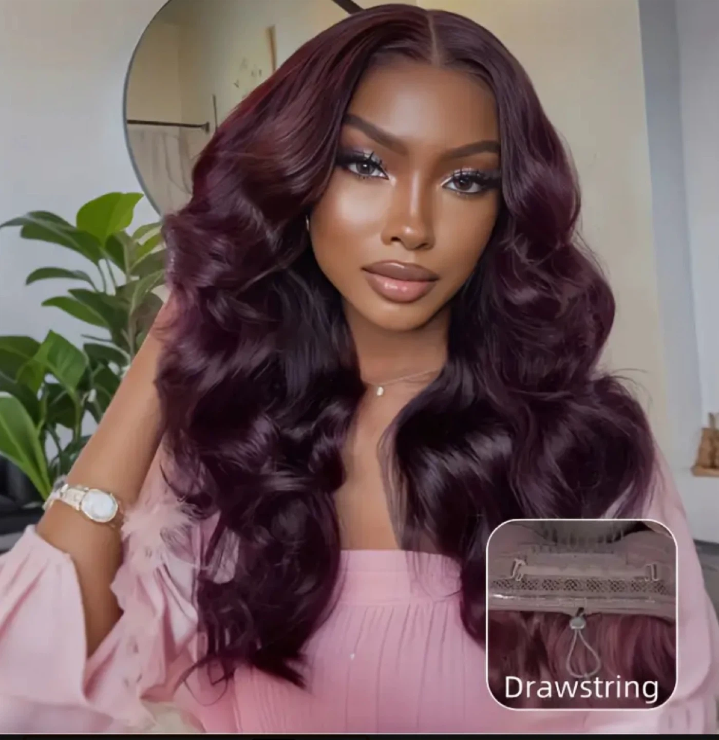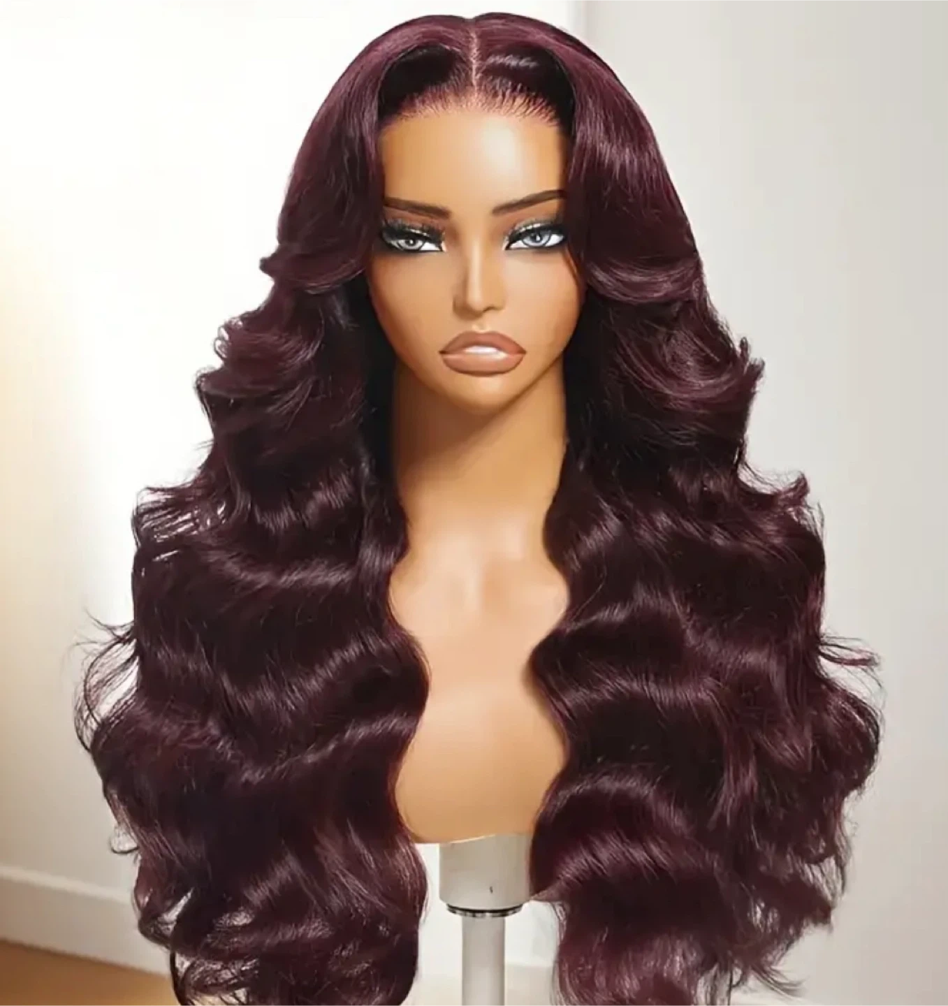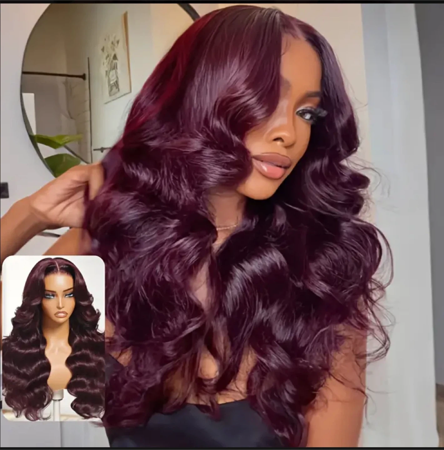 Here is a beautiful burgundy lace front wig. It has a natural wave pattern and is perfect for a night out or everyday wear. It appears to be in great condition! Human hair
