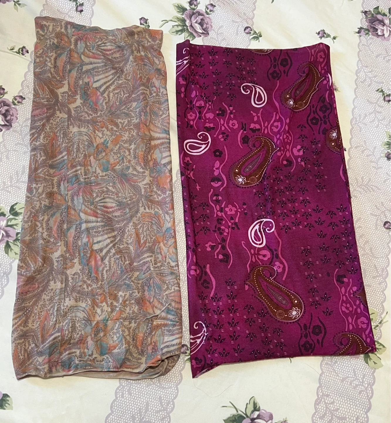 Two scarves/turban with paisley and floral patterns. One is a light neutral colour, the other is a rich purple. Lightweight fabric.
