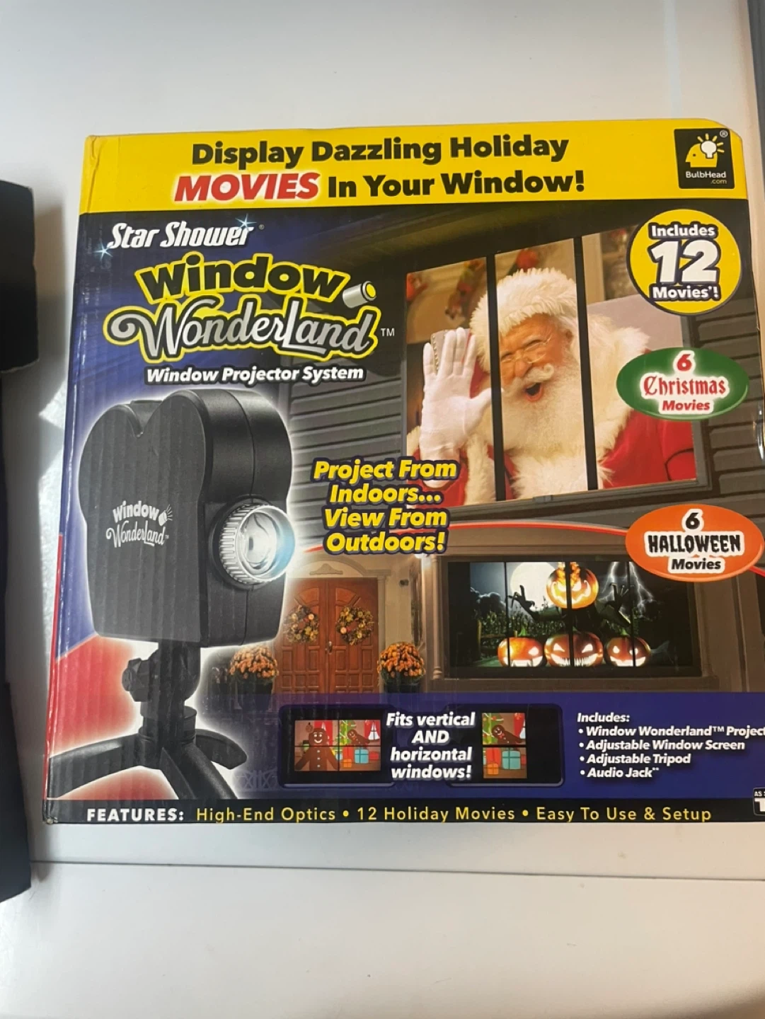 Display dazzling holiday movies in your window with this Star Shower Window Wonderland projector! It projects from indoors and can be viewed from outdoors. It fits both vertical and horizontal windows. Includes 12 holiday movies and has high-end optics for a great viewing experience
