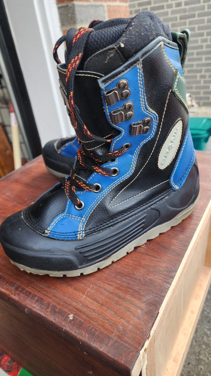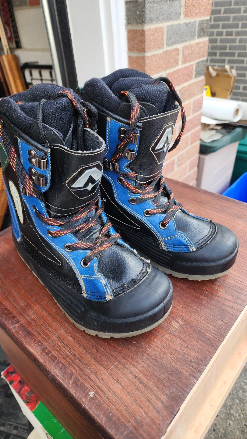 A pair of Airwalk snowboard boots. Black and blue colourway with orange laces. Lace-up closure system. These boots are pre-owned.