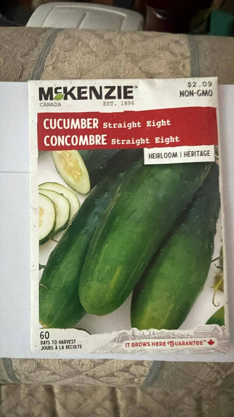 Selling 2 packs of McKenzie Cucumber Straight Eight seeds for $1.00 each. These are heirloom seeds and non-GMO. The packet says it takes 60 days to harvest. Originally priced at $2.09.