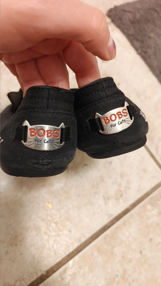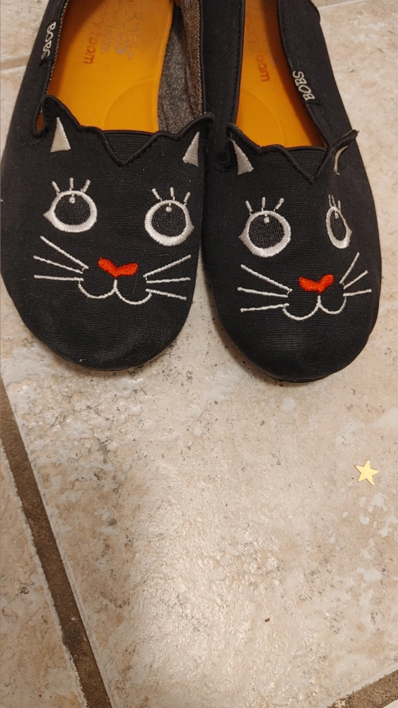 These BOBS for Cats flats are black with an embroidered cat face design. They're made of canvas with a cushioned insole. These shoes are fun for everyday wear!
