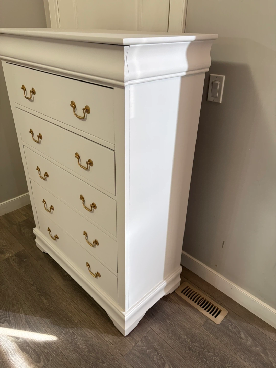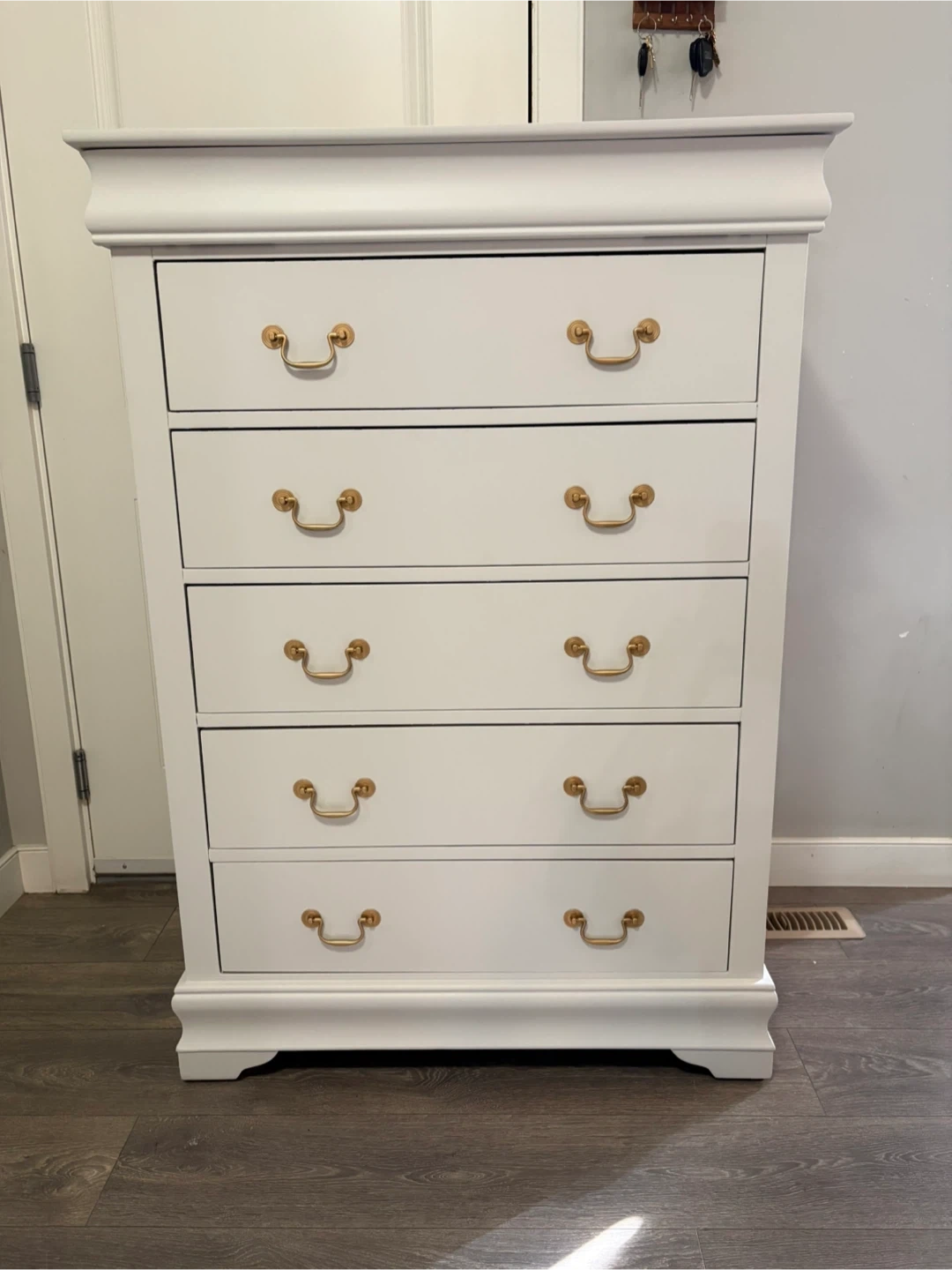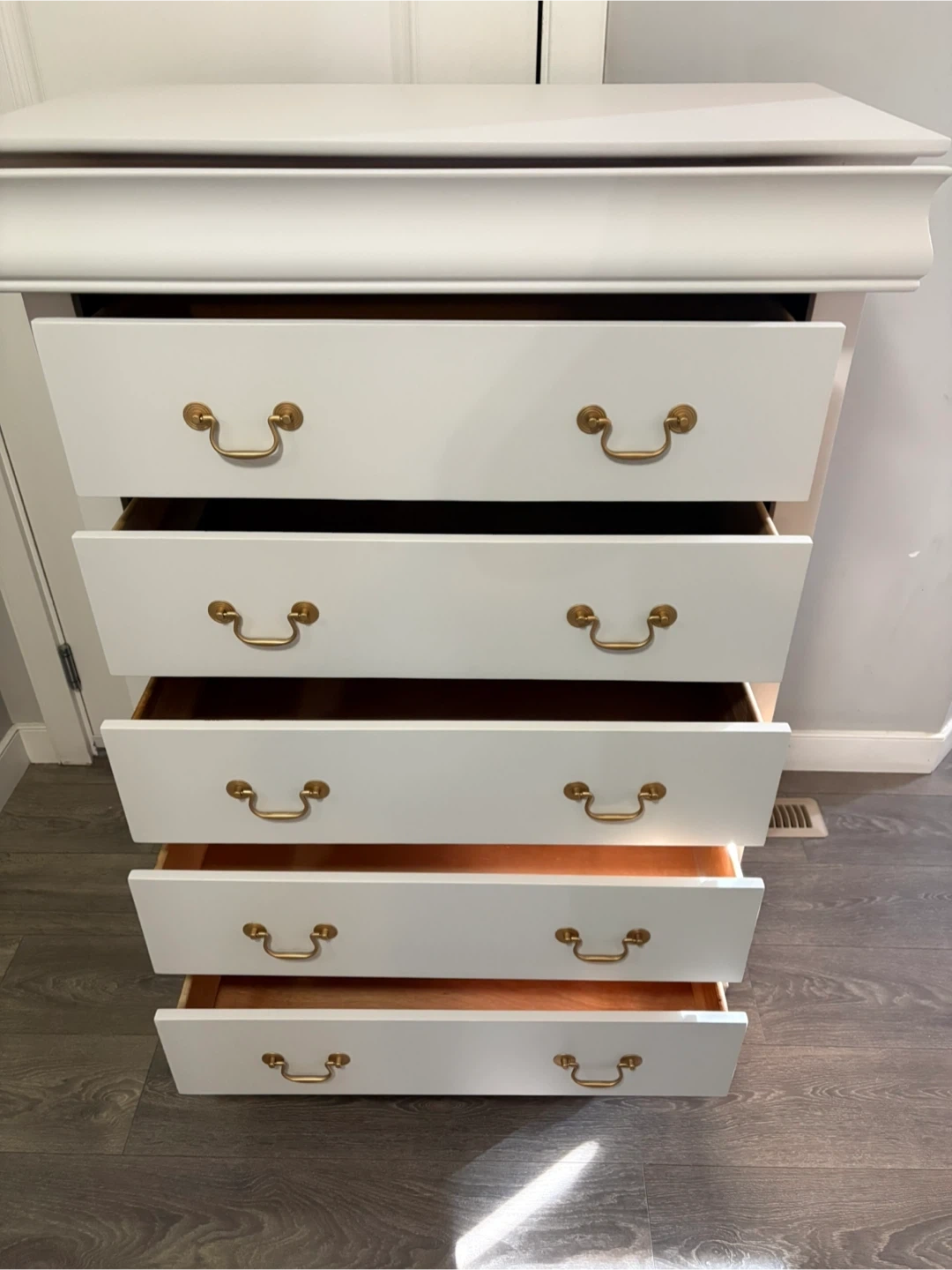 This is a charming solid wood dresser that has been refinished in neutral beige shade, perfect for adding a touch of elegance to any room! It features six drawers with gold hardware, providing ample storage. This dresser is in great condition. The drawers are very clean and slide smooth with locking rails.