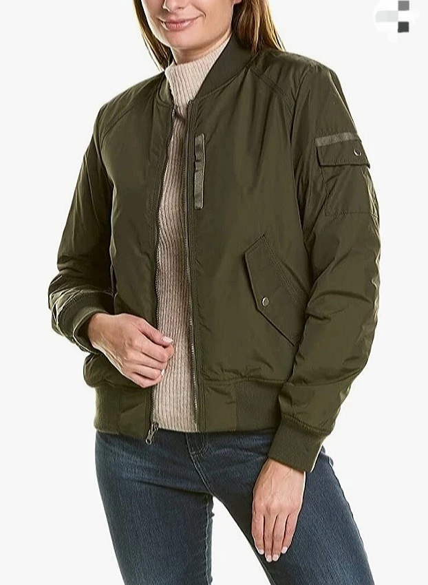 This Women's green reversible bomber jacket features a cozy sherpa lining. It has a full zipper closure and multiple pockets. Ribbed cuffs and hem provide a snug fit. Its ruched sleeve detail adds a stylish touch.
