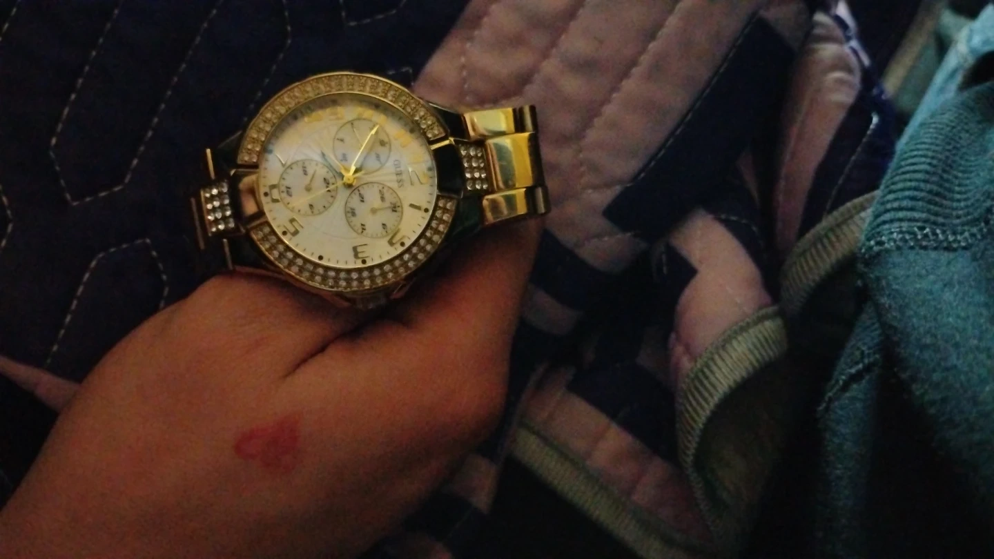 This is a gold-tone Guess watch with crystal accents. It features a white dial with sub-dials and a gold-tone band with crystal details. The watch also comes with a white silicone strap for interchangeable wear.