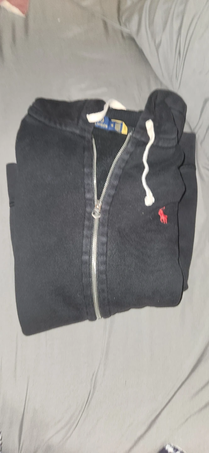 Polo Ralph Lauren full-zip hoodie in black. Features a red embroidered logo and white drawstrings. It's a size Medium. In amazing condition