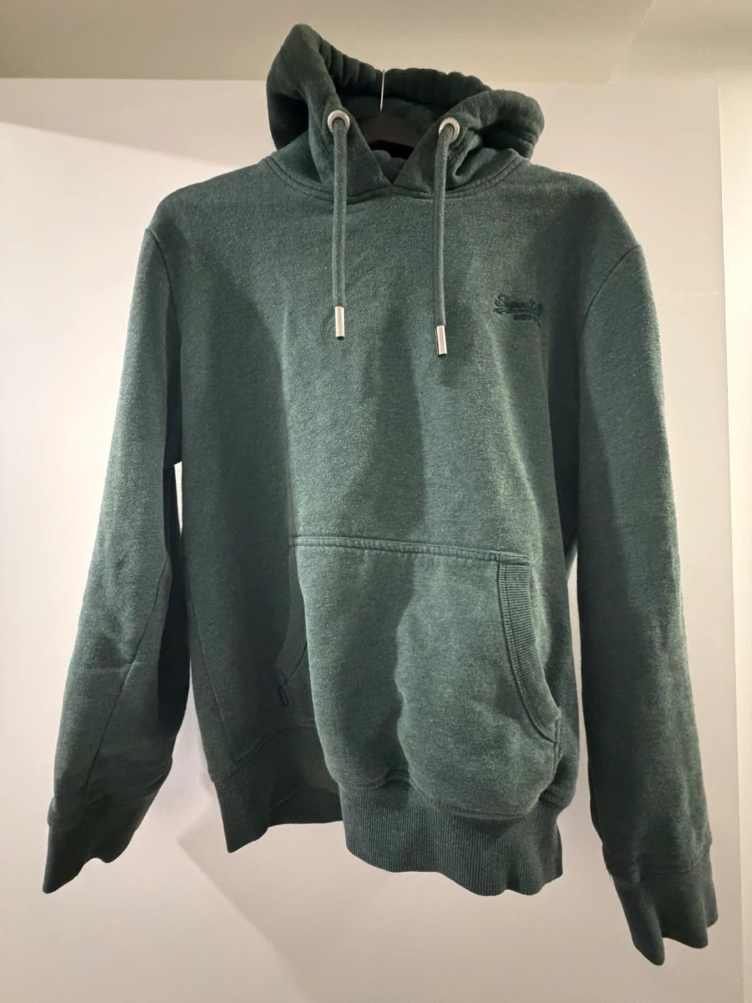 A comfortable dark green hoodie from Superdry. It's a size small and made from a soft material. This hoodie is great for casual wear.