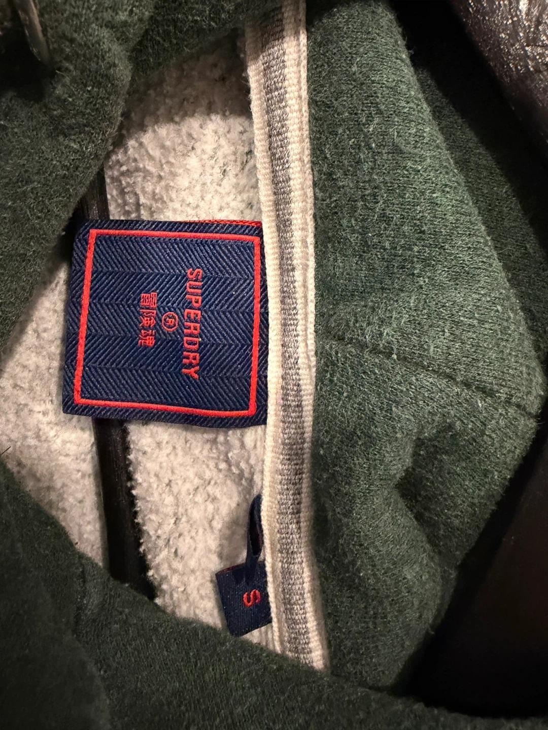 A comfortable dark green hoodie from Superdry. It's a size small and made from a soft material. This hoodie is great for casual wear.