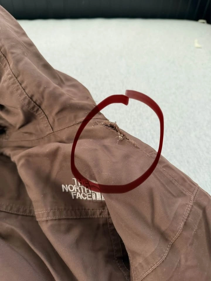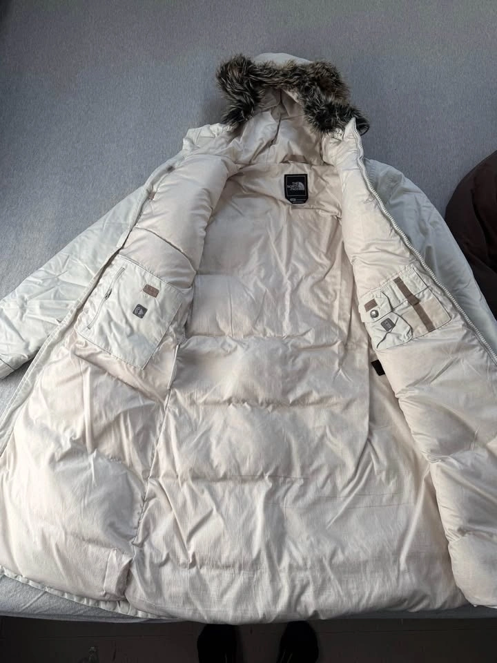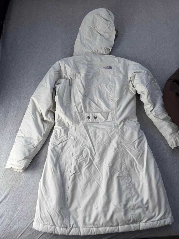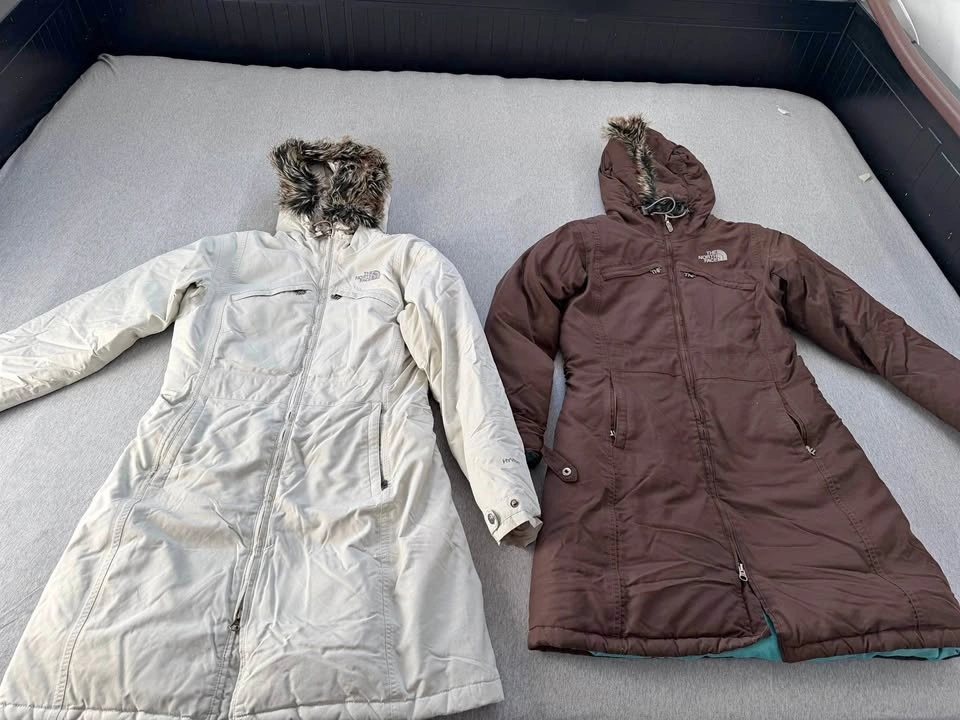 The North Face Women's Arctic Parka in light and brown. Both are in good used condition, size small. The brown one has a small rip on the shoulder. As is.