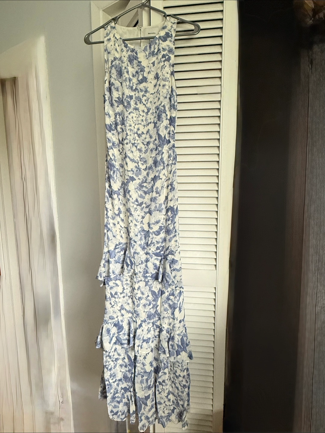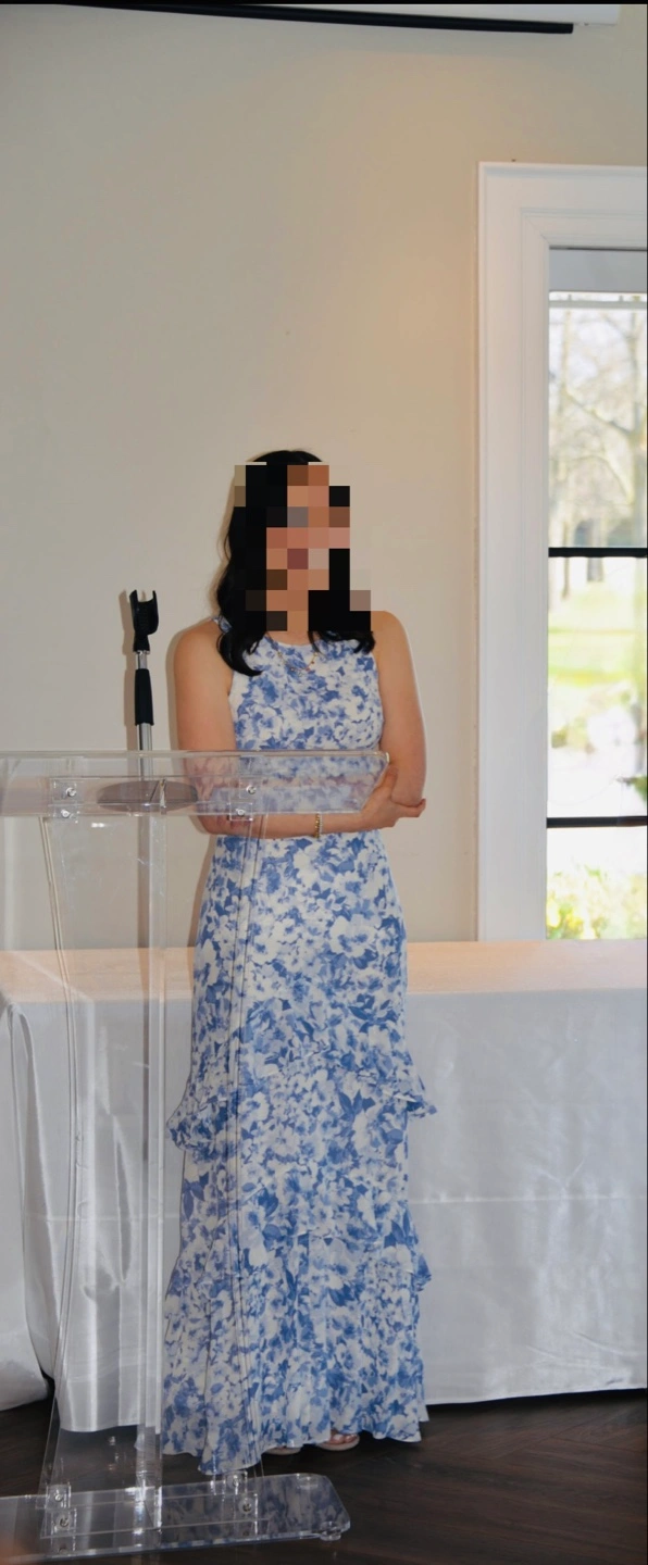 Beautiful blue and white floral dress. Sleeveless. Fitted throughout with tiered skirt. Floor length on 5’4” frame with high heels. Back zipper closure with button on top. Side ruching. Perfect for a wedding or special occasion.