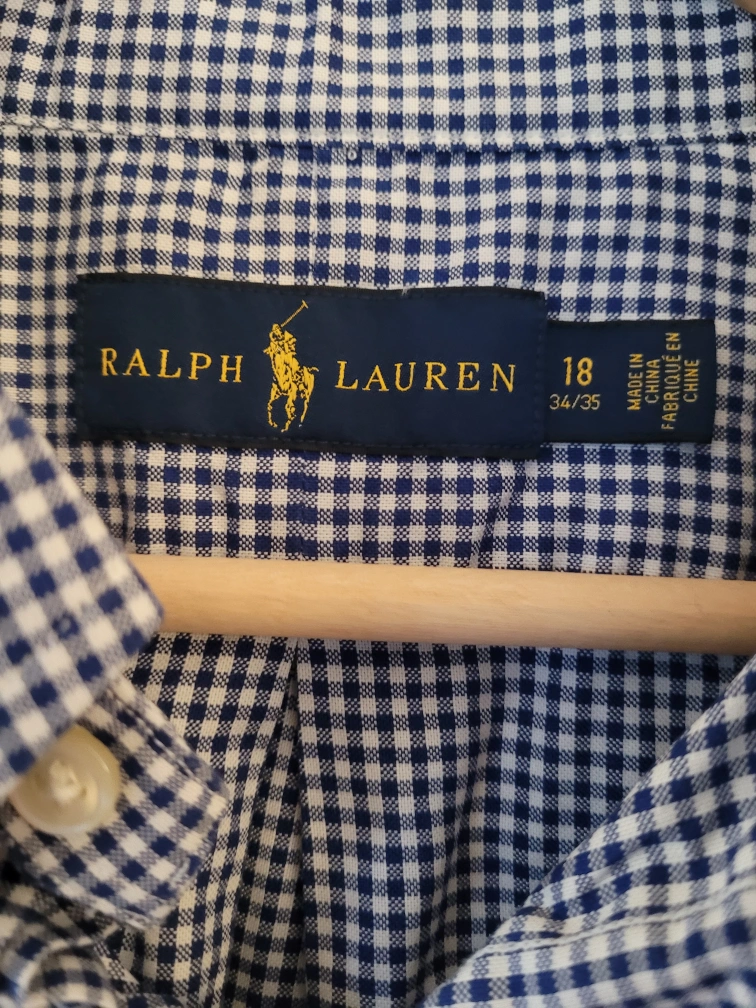 Classic Ralph Lauren men's button-down shirt. Blue and white gingham pattern. Long sleeves. Size 18 (34/35).